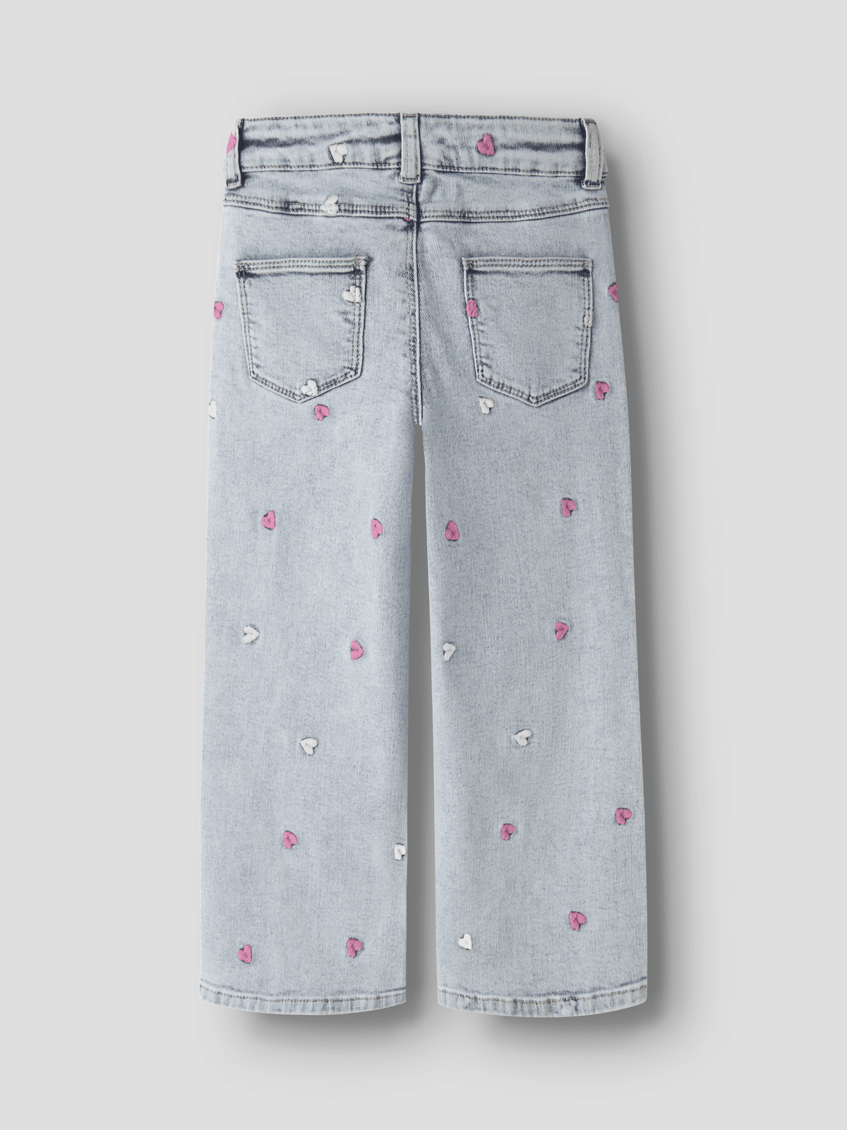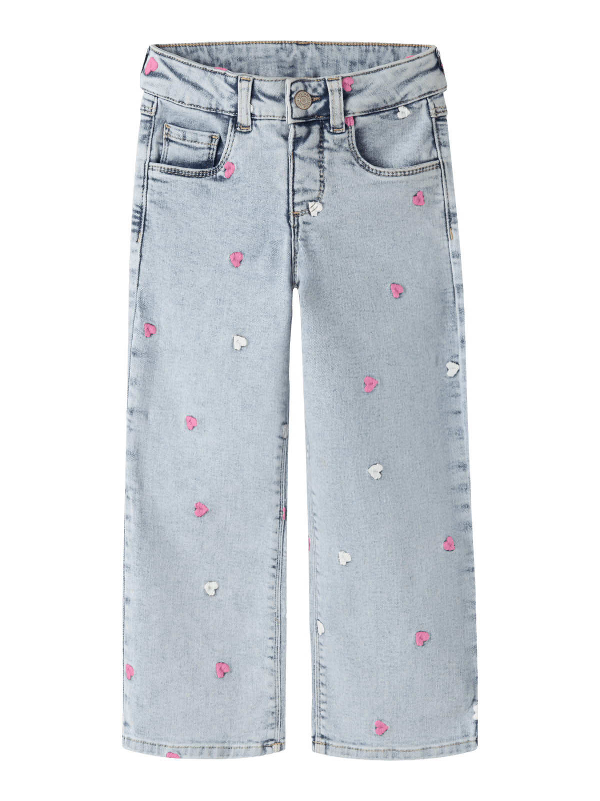 Sett sammen det perfekte antrekket til barnet ditt med hverdagsstyles av høy kvalitet, og skap en komfortabel og trendy look. Denim er et slitesterkt vevd stoff som finnes i flere uttrykk for et unikt look. - Produkttype : Jeans med wide fit - Lukking : Trykkknapp og halv mock feste - Lommer : Baklommer, Myntlomme, Forlommer - Detaljer : Justerbar midje, Brodert detalj - Vask/finish : Diskré rifter - Passform : Dette paret med jeans har regular fit på hoftene og wide fit på bena