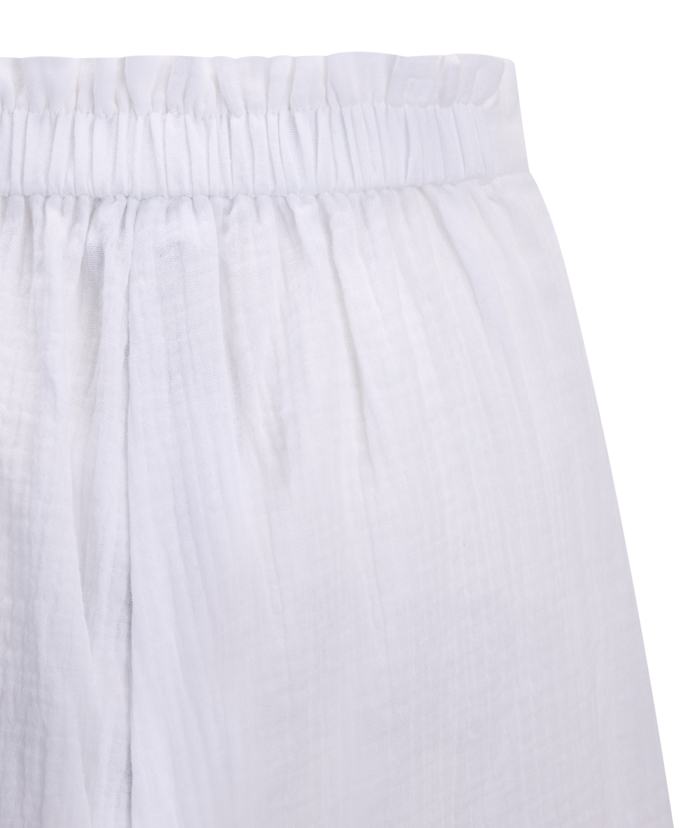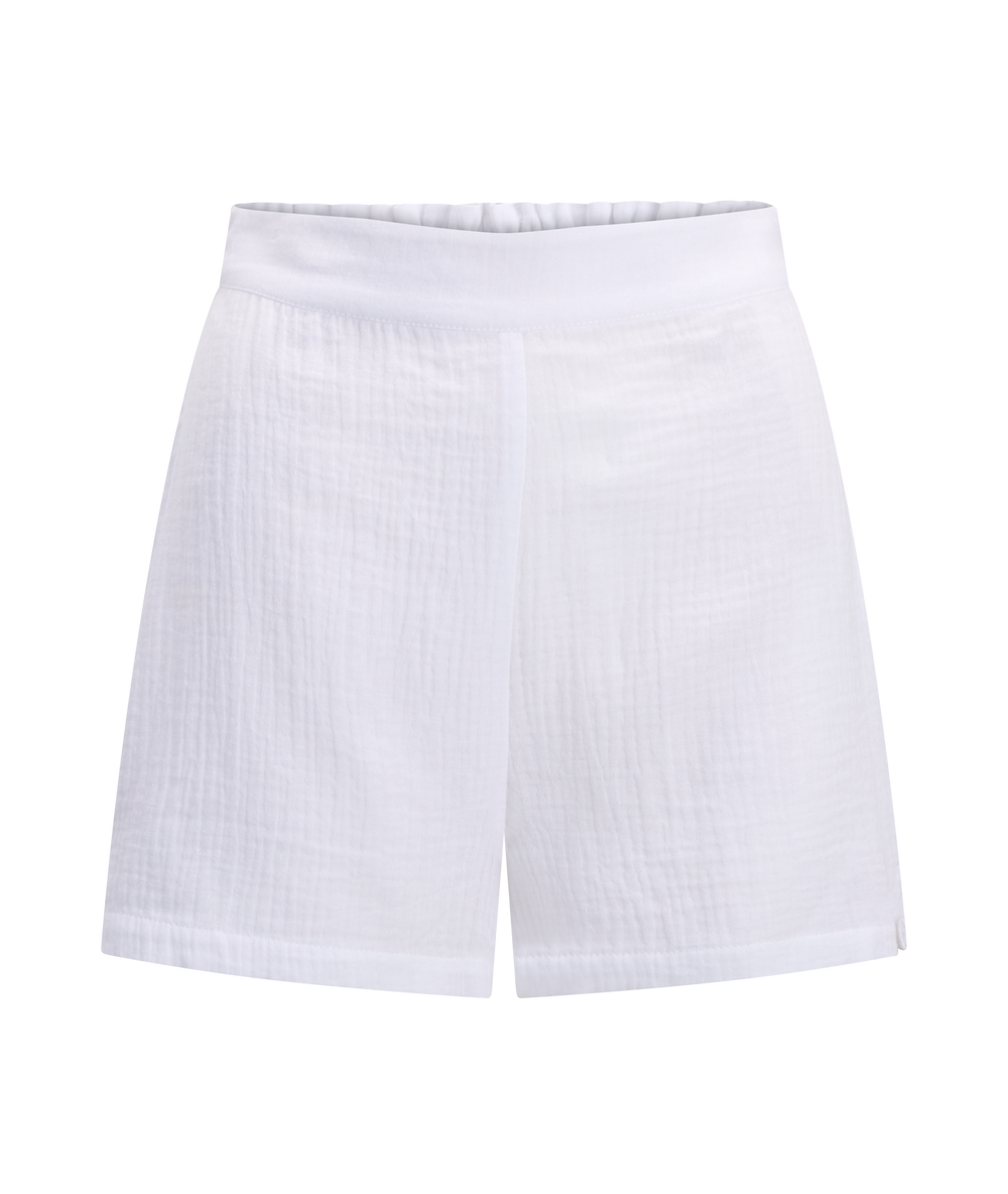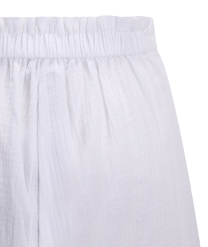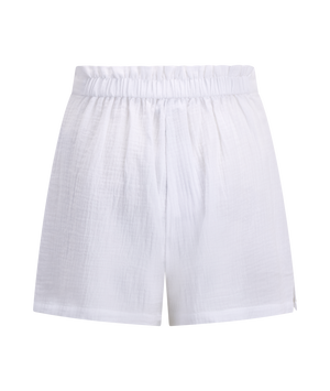 Denne shortsen kommer i en ren hvit farge med et lett, luftig uttrykk som passer perfekt til varme dager. Designet er enkelt og stilrent, med en komfortabel løs passform som gir bevegelsesfrihet. Den elastiske midjen sikrer en behagelig passform enten du foretrekker den midt på eller høyere opp i livet.