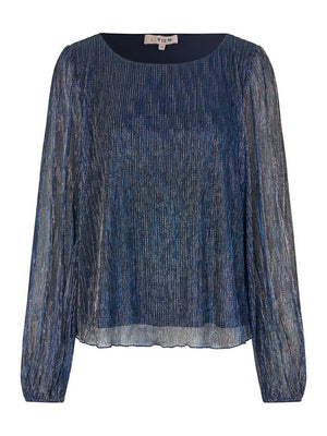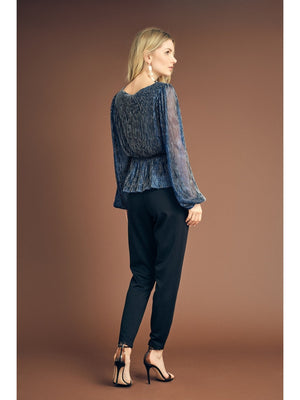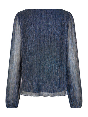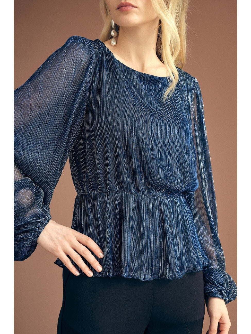 The Fiba blouse is a loose-fitting blouse, that cinches at the waist with an elastic band. The blouse has long, loose sleeves made by a glitter material.