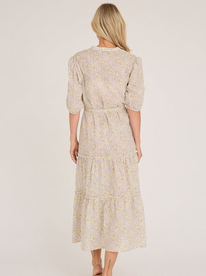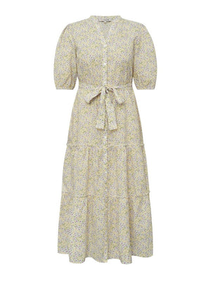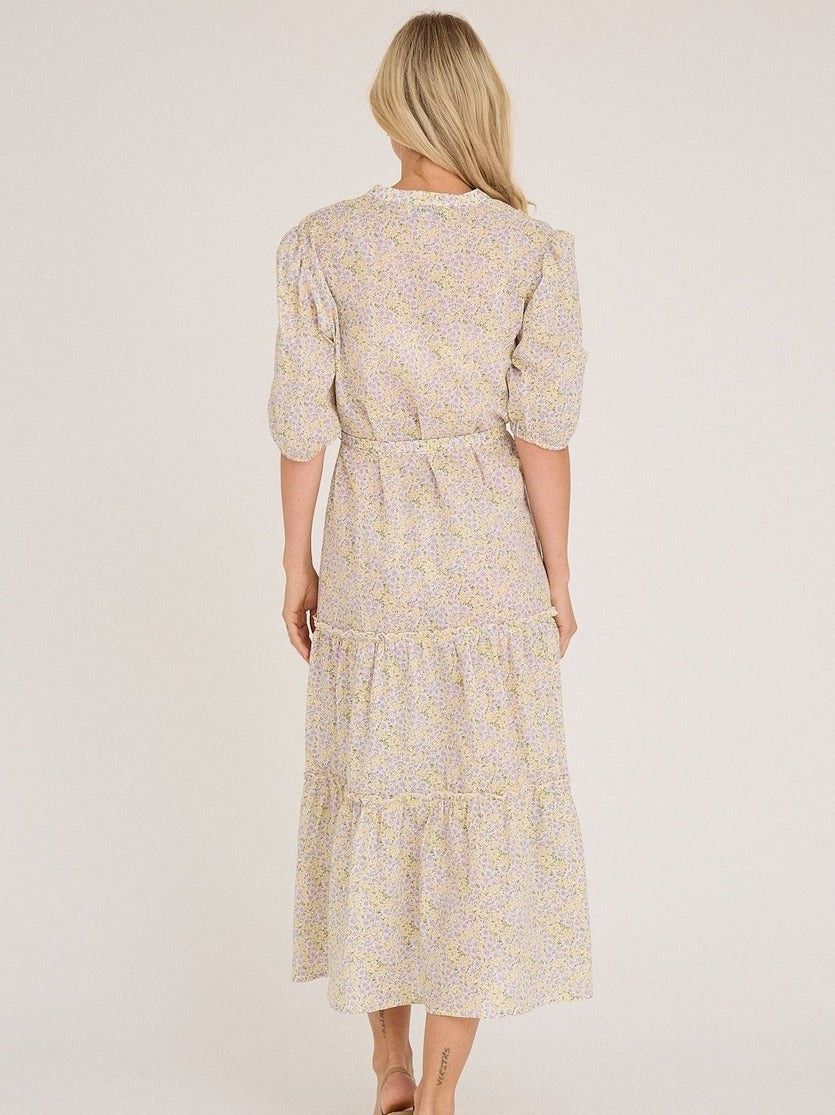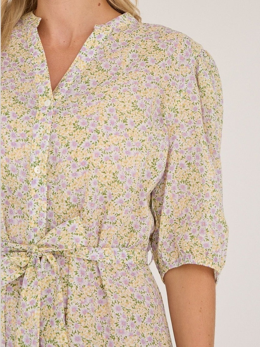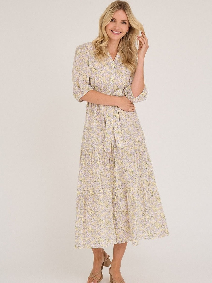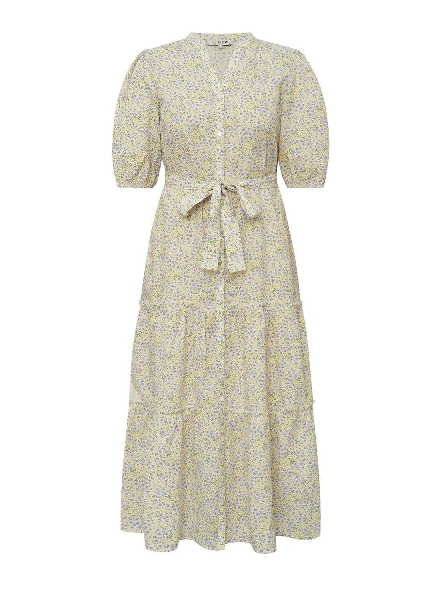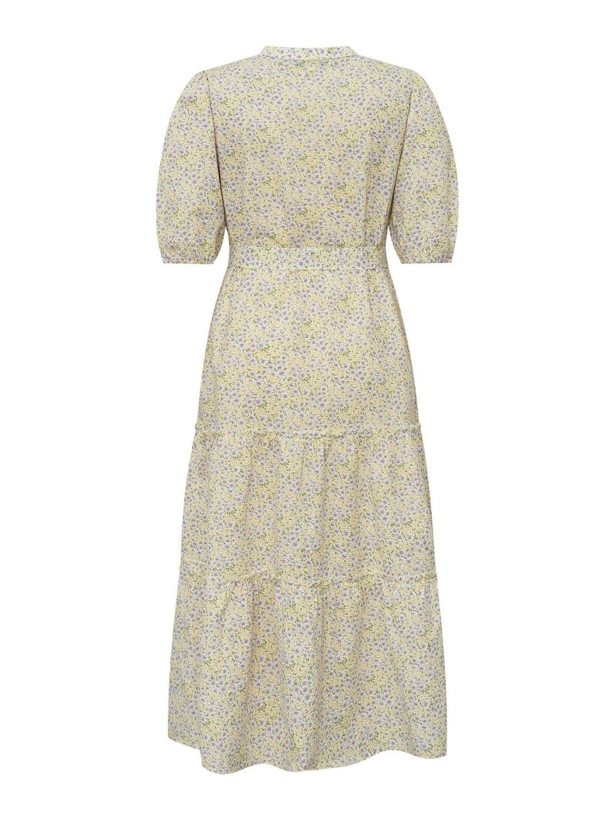 En lang, blomstermønstret kjole i sarte nyanser av lilla og gul, med lette volanger og puffermer som tilfører et feminint preg. Kjolen har en behagelig v-hals og er designet med en rekke knapper foran, som gir den en skjortekjole-look samtidig som den er elegant. Den medfølgende knytingen i livet kan formes til en sløyfe, noe som fremhever midjen og gir en flatterende silhuett.