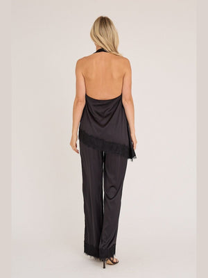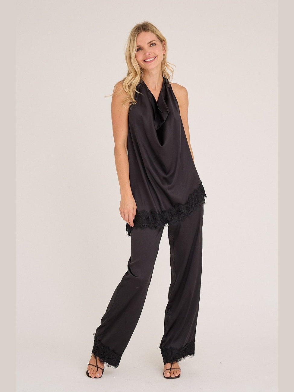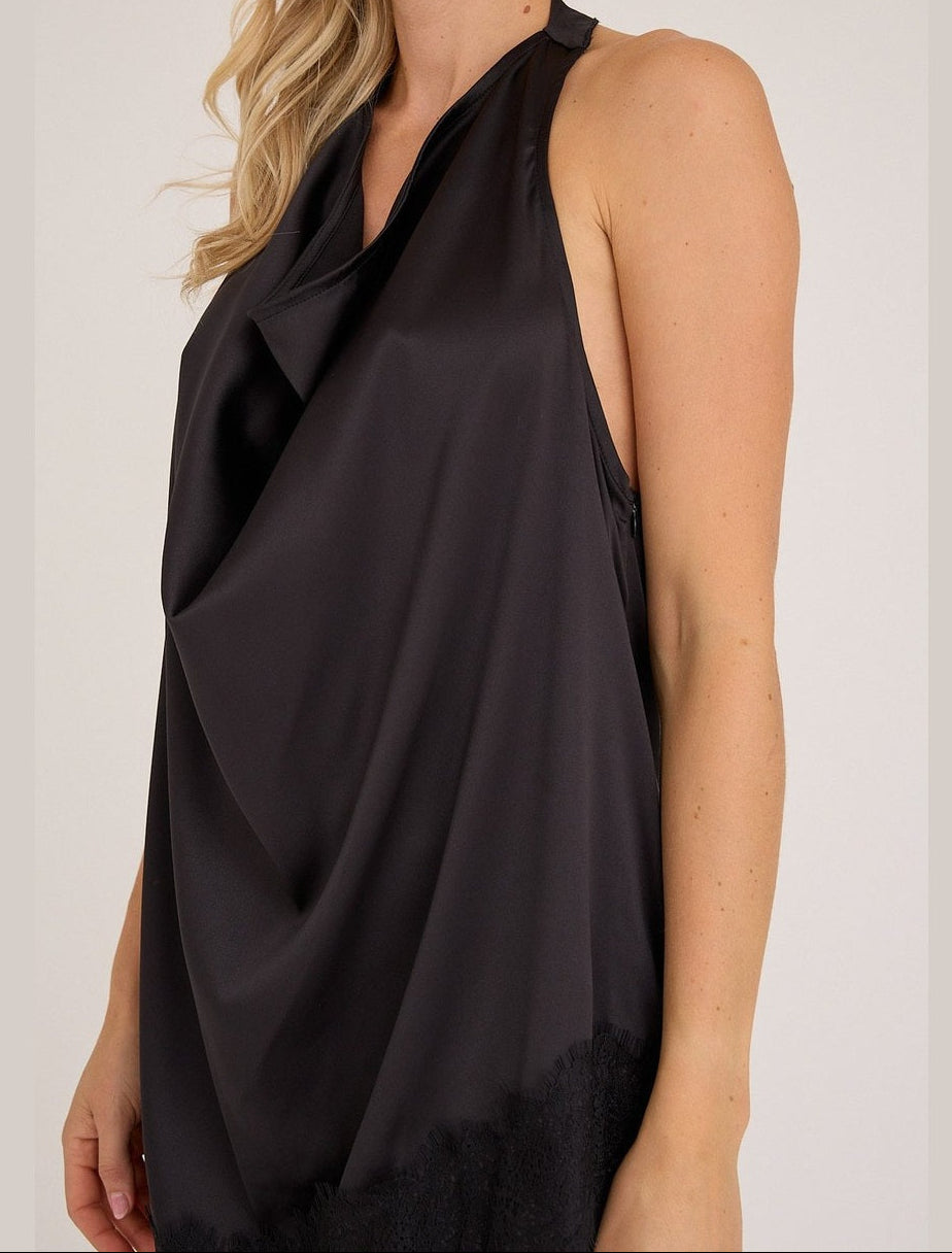 Den asymmetriske Katti-toppen er en elegant, ermeløs topp i blank satengkvalitet. Toppen har en vakker drapert utringning og en flatterende, løs passform. Den har åpen rygg og lukkes i nakken. En delikat blondedetalj langs kanten gir et feminint preg.