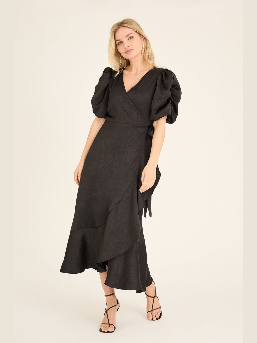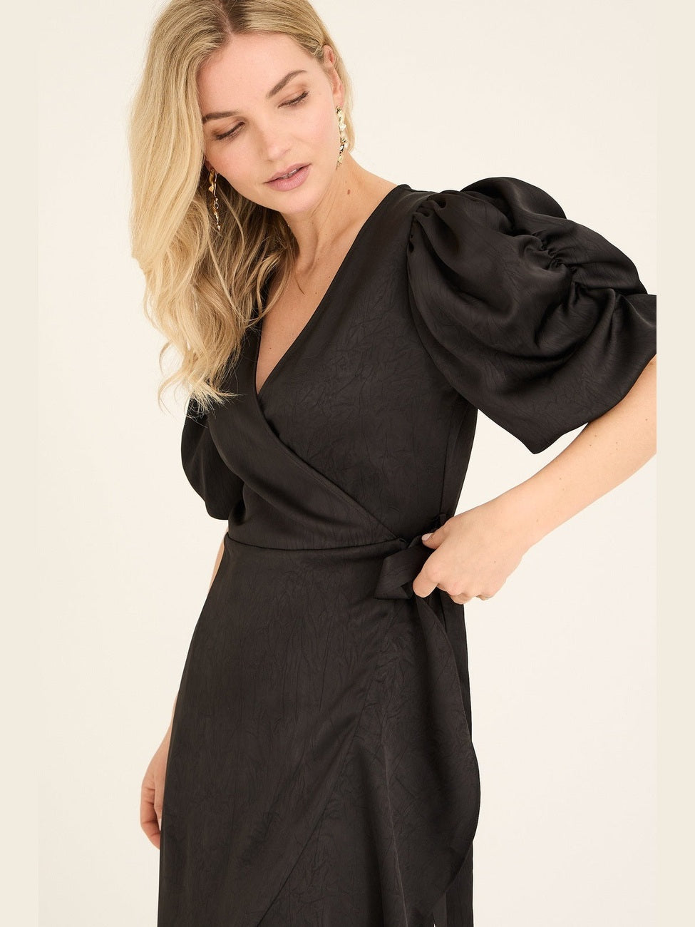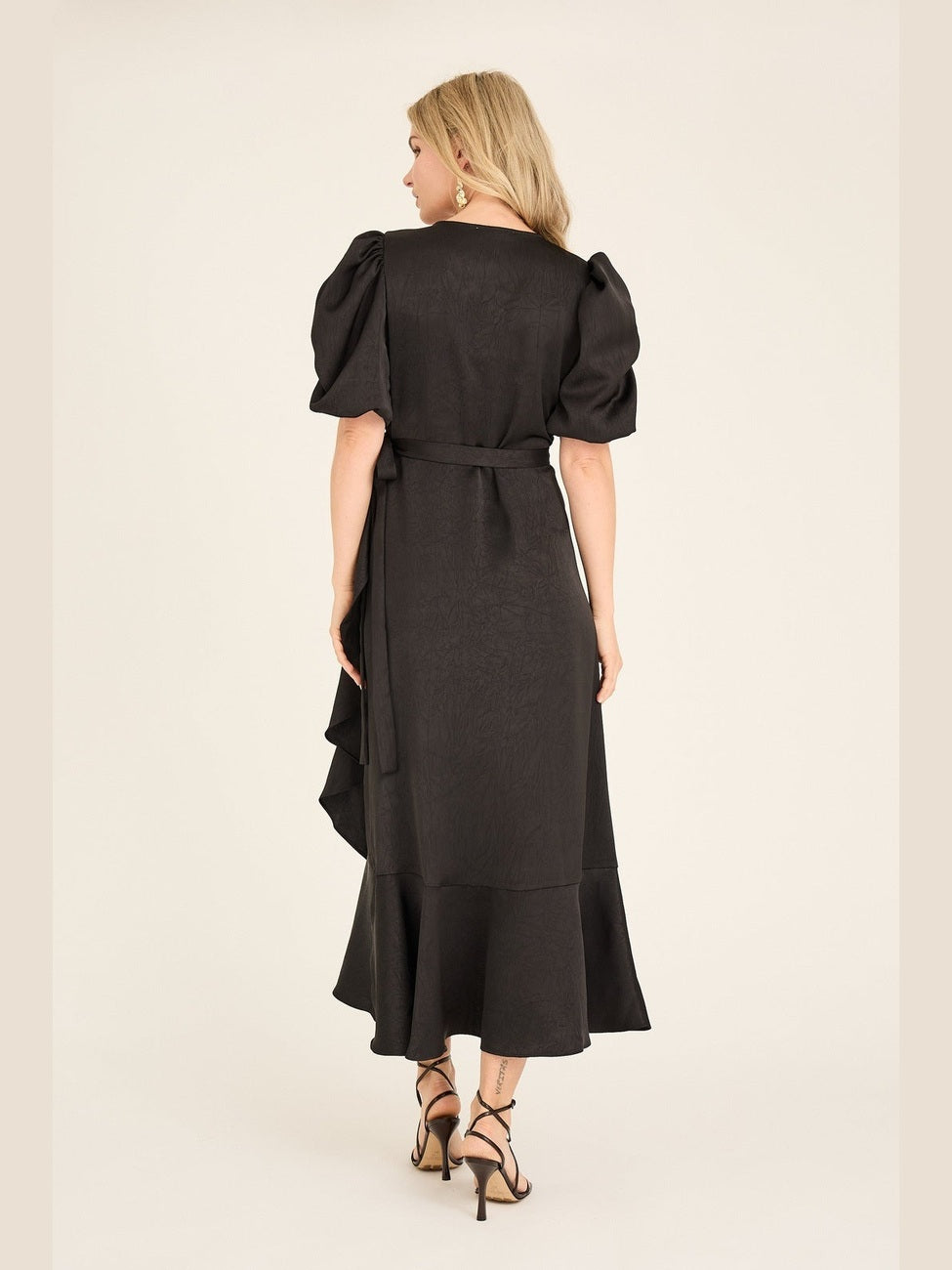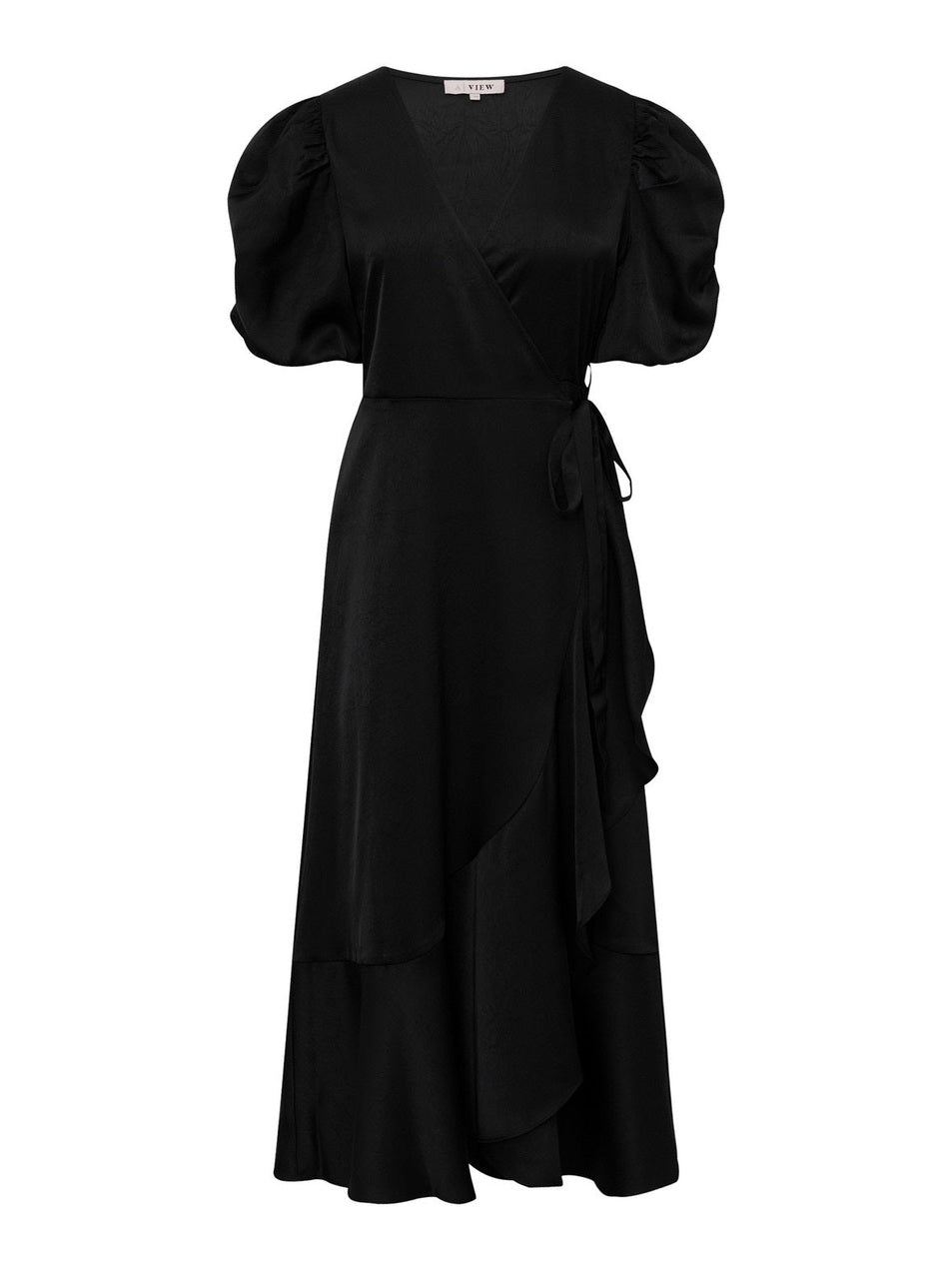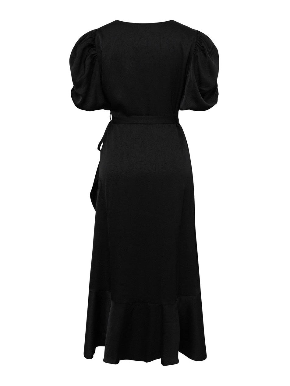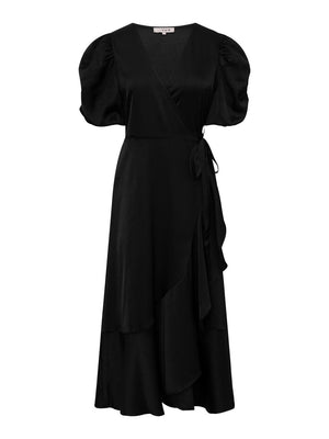 Sinda-kjolen er en elegant omslagskjole med satengaktig utseende, korte puffede ermer og asymmetrisk volangkant. Kjolen har en V-utringning og normal passform.