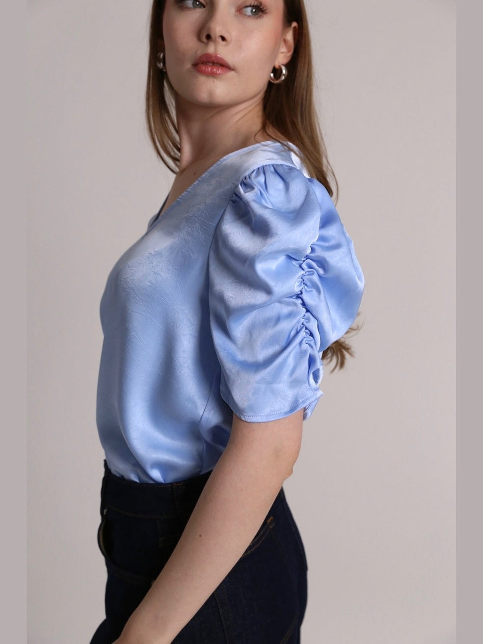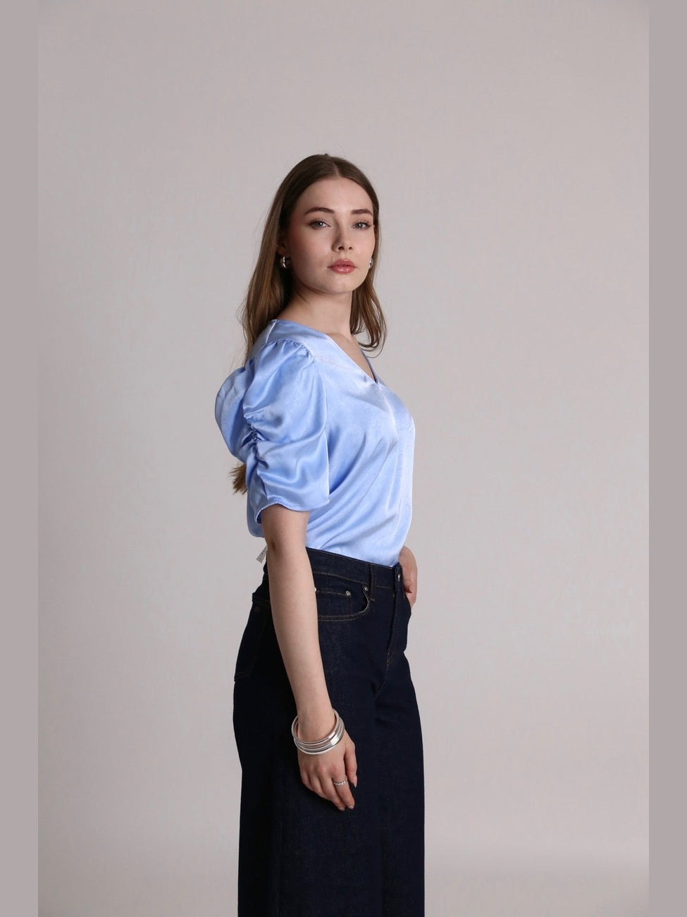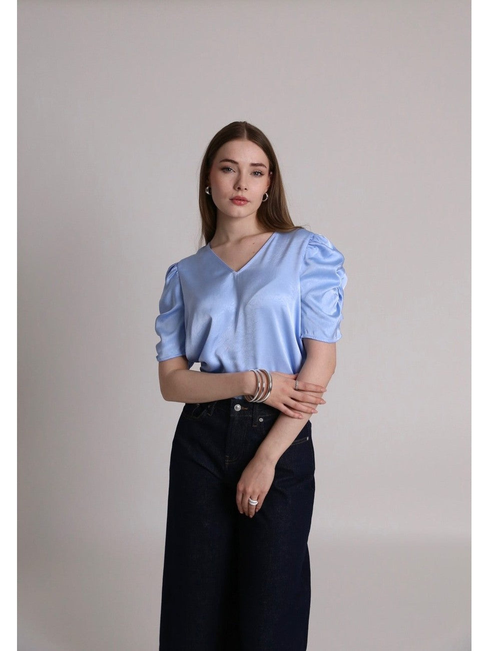 The Sindrella Blouse is an elegant blouse with a v-neckline and short puff sleeves. The blouse has a feminine silhouette with a loose fit. The blouse is true to size. - Puff sleeves - V-neckline - Light, shiny quality - Loose fit