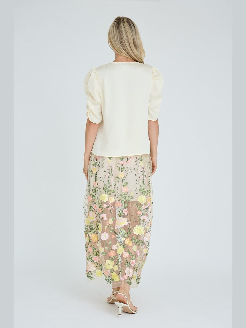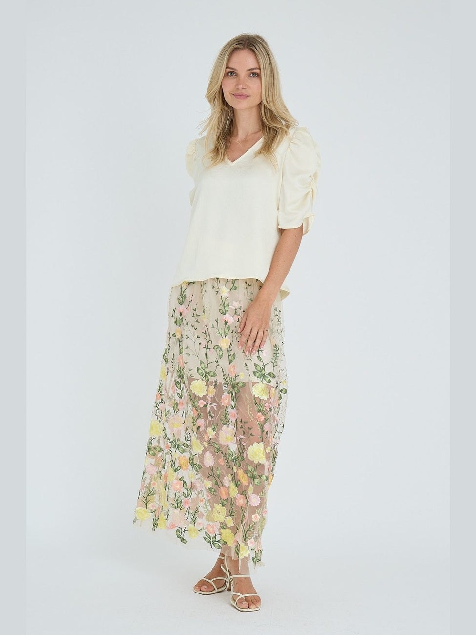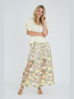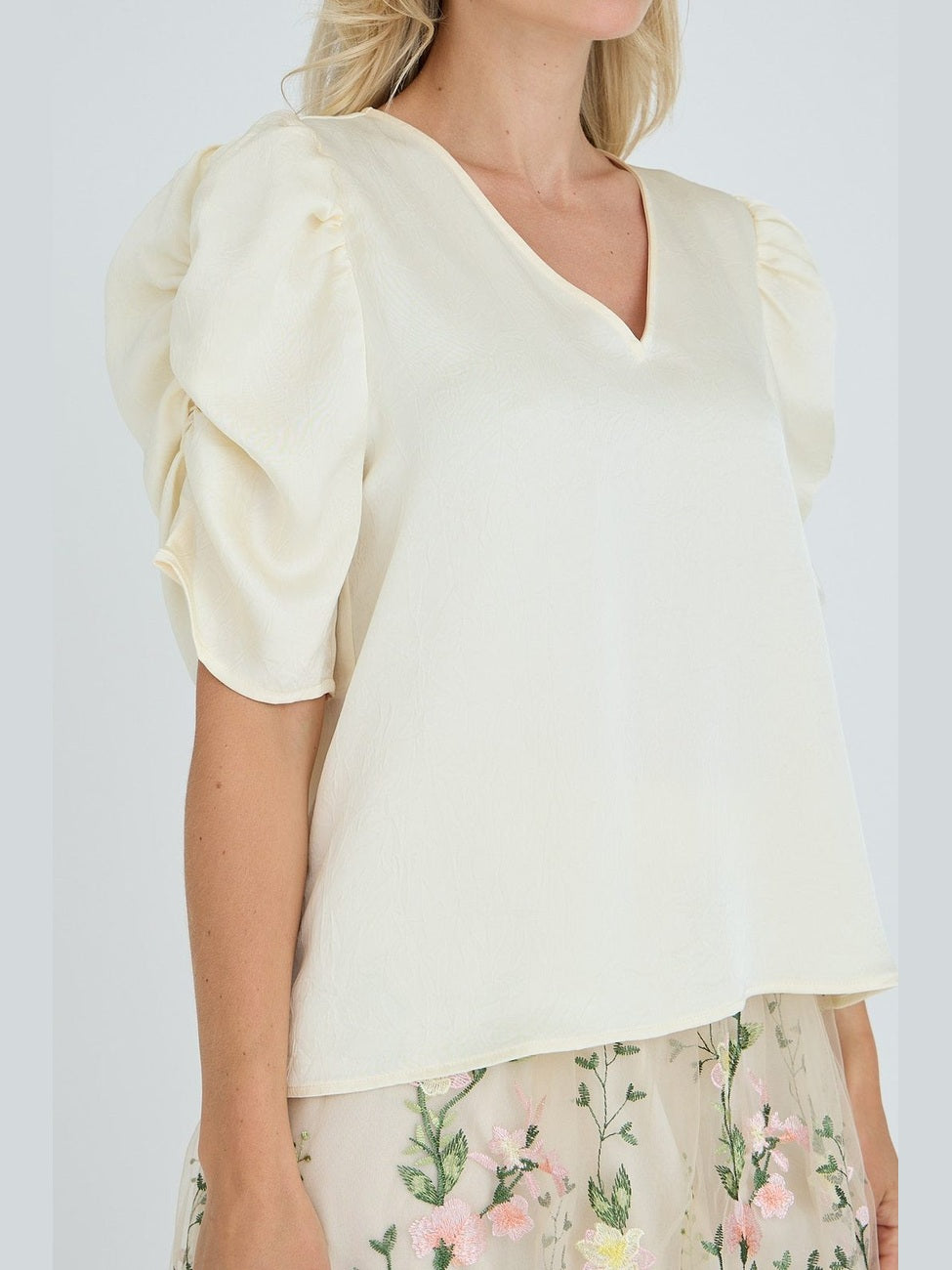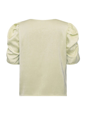 The Sindrella Blouse is an elegant blouse with a v-neckline and short puff sleeves. The blouse has a feminine silhouette with a loose fit. The blouse is true to size. - Puff sleeves - V-neckline - Light, shiny quality - Loose fit