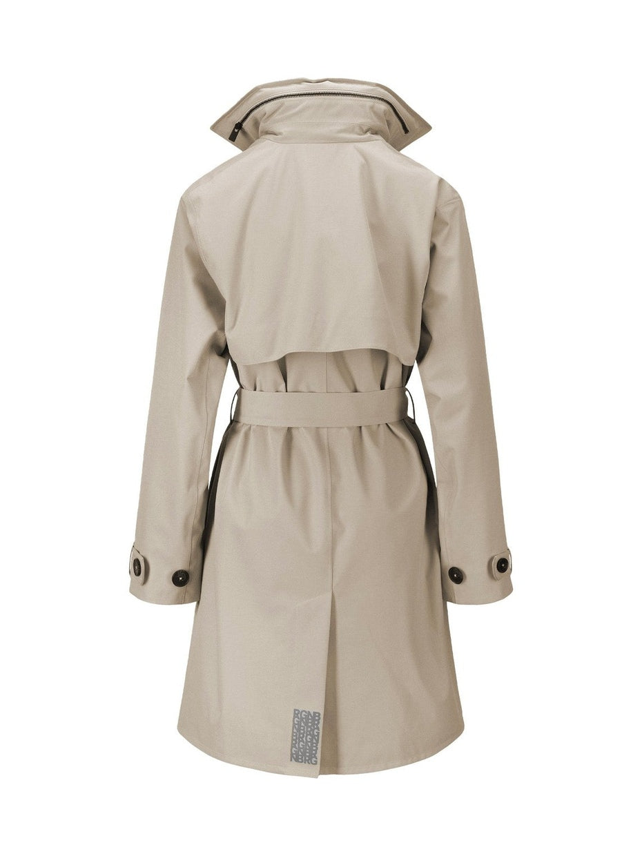 Yr’en Coat i Sand, er en vanntett, tidløs og klassisk trench coat. Regnjakken har vannsøyle på hele 20.000 og gode pusteegenskaper. Modellen kommer med hette i kragen, mansjetter med knapper, refleksdetaljer og samme glatte stoff som i bestselgeren Regndråpe Trench.