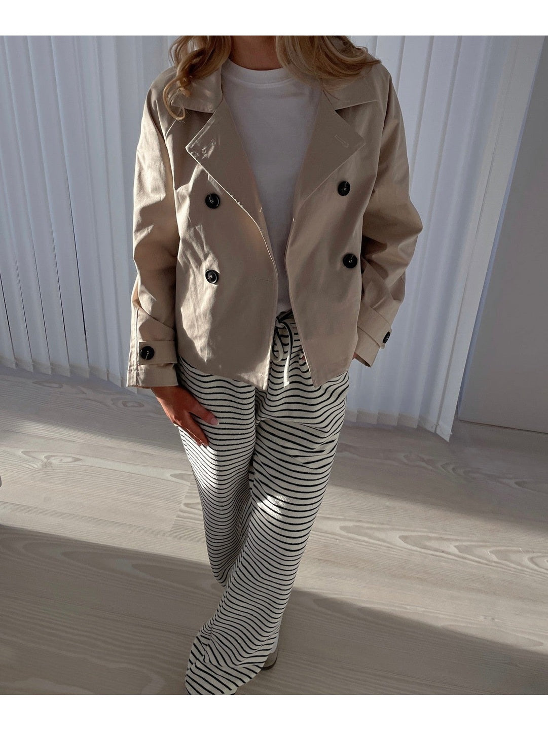 Deilig bukse i Frotté med hvite og sorte striper og lommer på hver side. Har en tynn elastisk bånd og en vanlig snor rundt midjen.