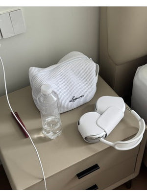 Toalettmappe i hvitt vaffelstoff med svart logo og sidehank. Sømløst fôr, vattert med padding og solid glidelås.