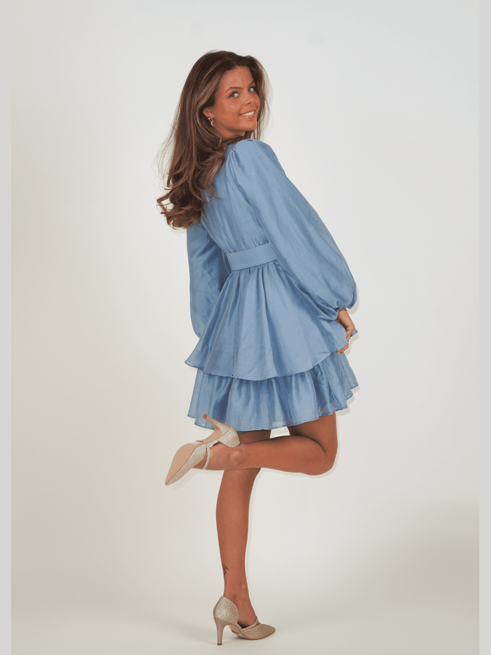 Abina Dress har et nydelig uttrykk. Kjolen legger seg elegant over brystet, hr en halv-dyp v-utringing og har lange trumpet-ermer med strikk nederst og skjult glidelås i siden. Den er lett og luftig, med underkjole i bomull for en behagelig tekstur mot kroppen. Det flotte skjørtet gir kjolen et unikt uttrykk som kler utrolig mange.