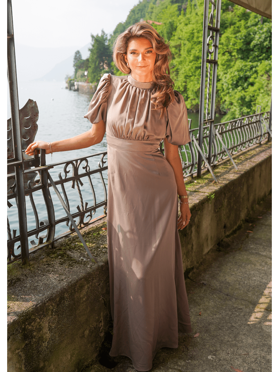 Puffede ermer med lett volum, delikat rynking over brystet og et avtagbart belte fremhever midjen på en vakker måte. Du styler den slik du ønsker. Skjult glidelås bak og en liten splitt gir en sømløs finish. Den myke underkjolen sørger for komfort hele dagen og hele kvelden.