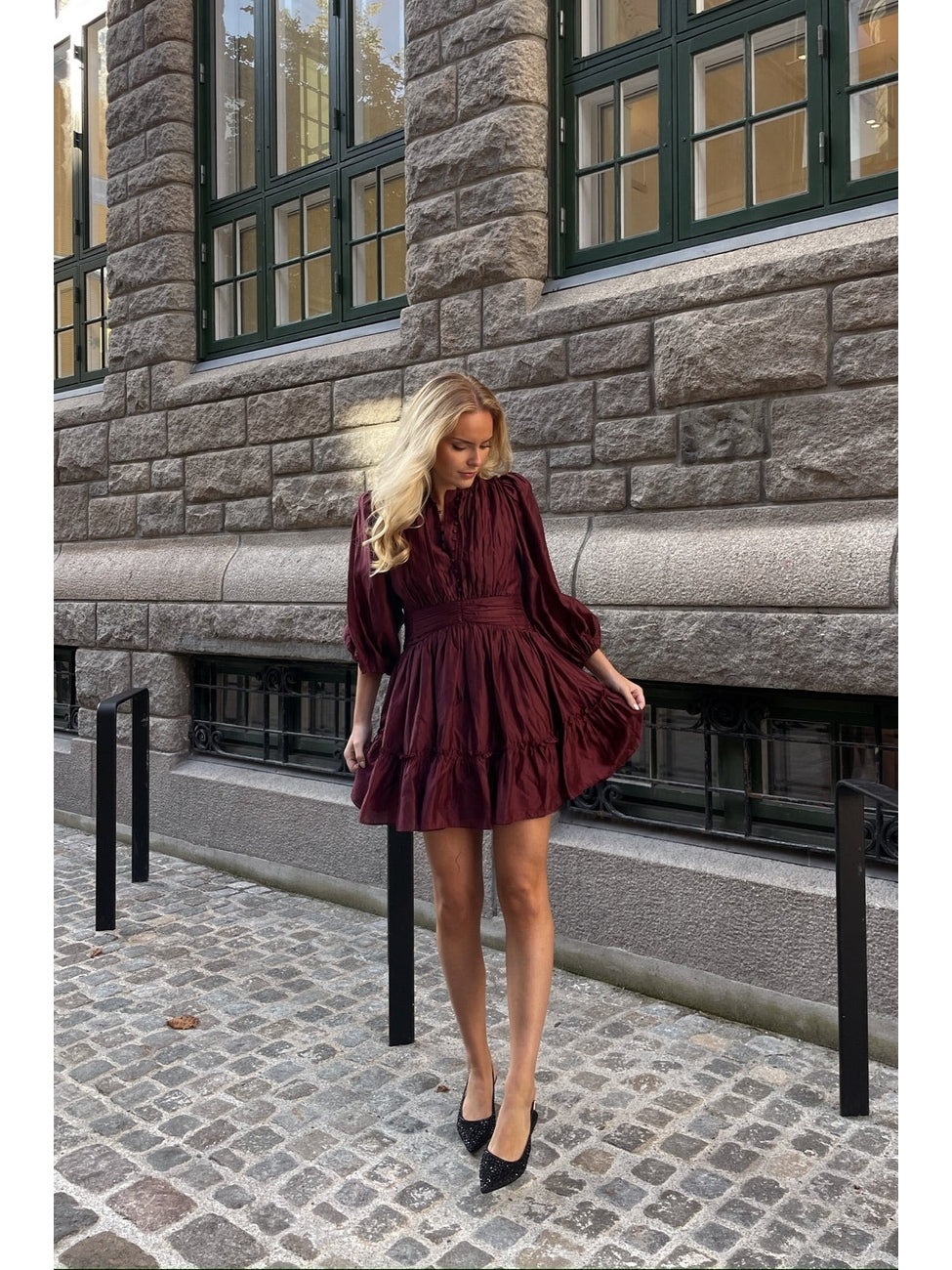 Vanity har flotte-rynke detaljer over hele kjolen, 3/4 voluminøse ermer og glidelås i siden. Den er lett og luftig, med underkjole i bomull for en behagelig tekstur mot kroppen. De flotte trykte knappene er ikke bare dekorative men kan også åpnes for å få utringing i stedet for høy krage.
