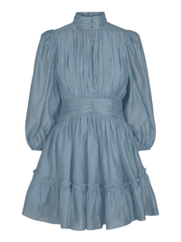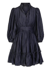 Vanity har flotte-rynke detaljer over hele kjolen, 3/4 voluminøse ermer og glidelås i siden. Den er lett og luftig, med underkjole i bomull for en behagelig tekstur mot kroppen. De flotte trykte knappene er ikke bare dekorative men kan også åpnes for å få utringing i stedet for høy krage.