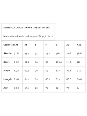 Wavy Dress i tweed er den perfekte kjolen for julebordet, en middag med venninner eller en dag på kontoret. Den har et vakkert og delikat snitt, samtidig som den har et spennende uttrykk. En garantert favoritt i klesskapet som enkelt kan styles til anledningen med et par fine høyhælte sko, lekre støvletter eller boots.