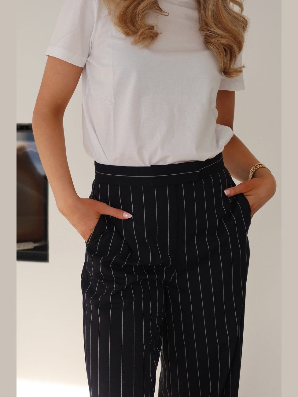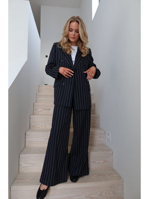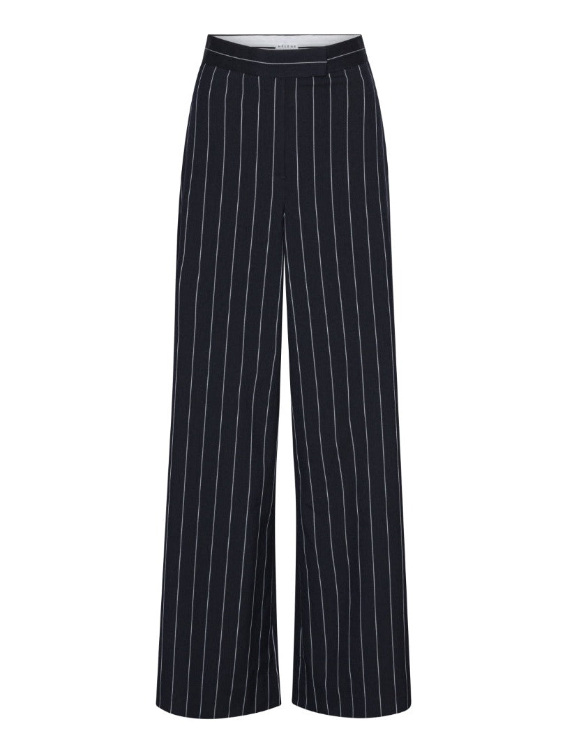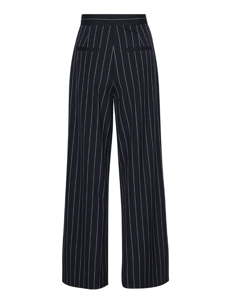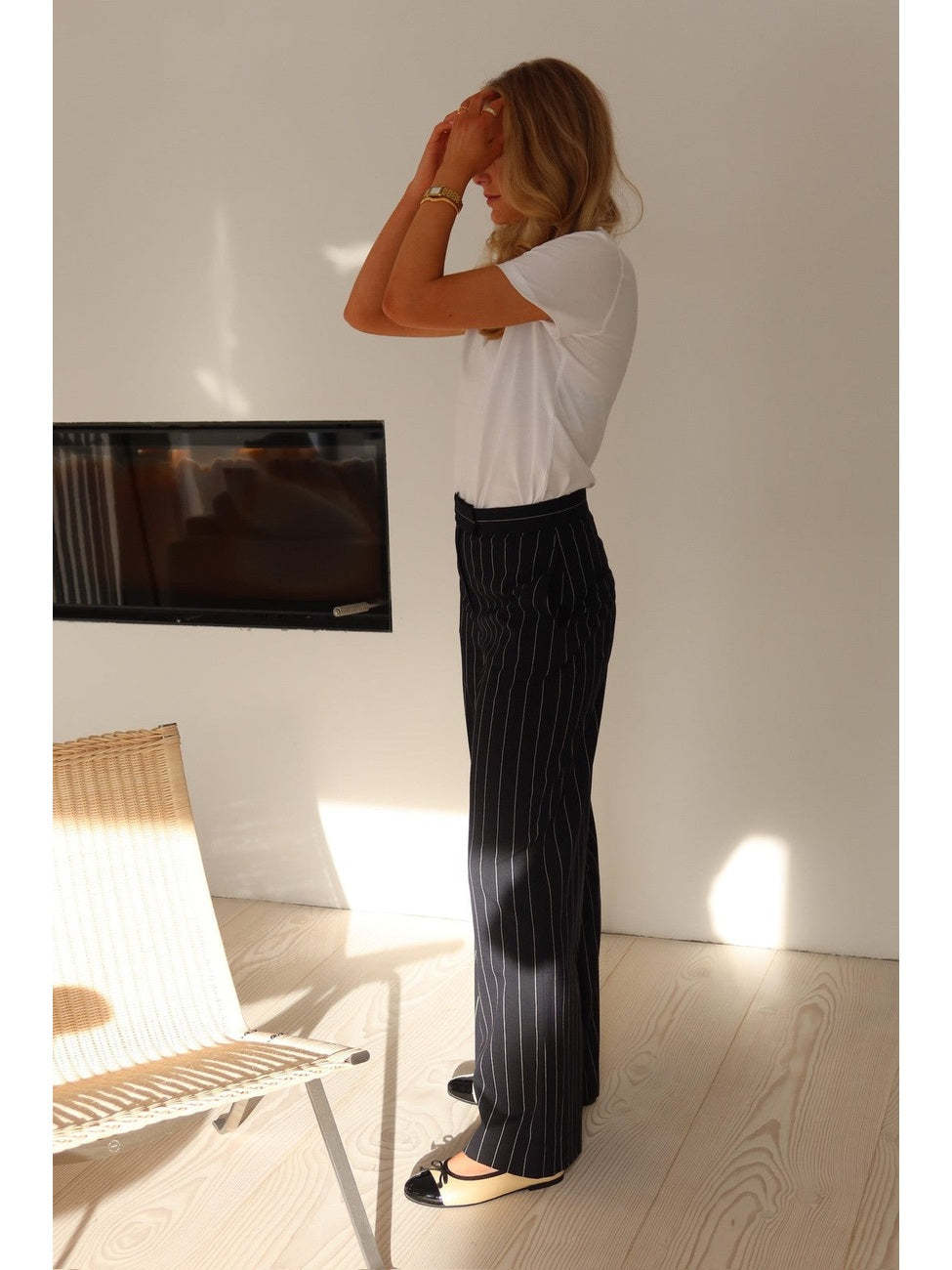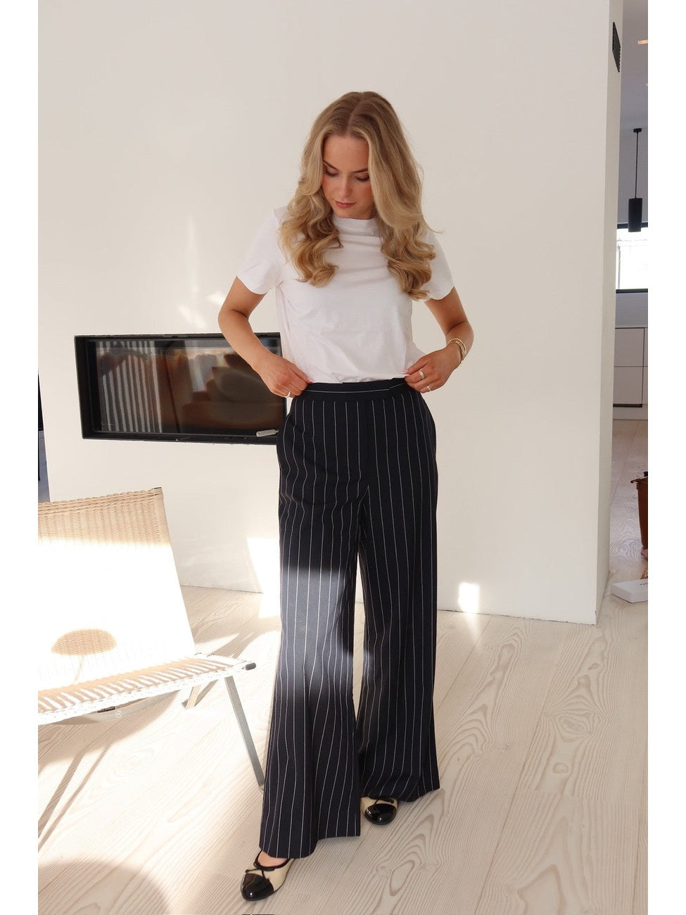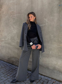Disse buksene med vid ben sitter høyt på livet og gir en flatterende passform som fremhever din silhuett. Designet med rene linjer og skreddersydd eleganse, har de vide ben som elegant faller til gulvet når de styles med flate sko, og gir et dramatisk, men raffinert preg. Perfekte både for kontorantrekk og hevede kveldsklær, kan disse buksene kombineres med den matchende Alma-blazeren for et polert, koordinert look. De er et tidløst garderobebasics for de som verdsetter uanstrengt sofistikasjon.