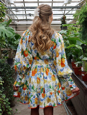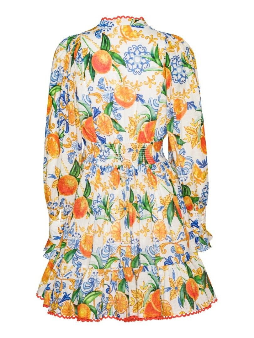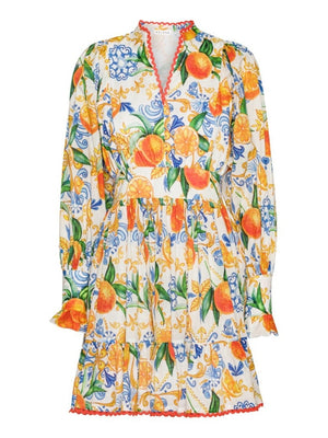Fordyp deg i La Dolce Vita med denne nydelige kjolen, prydet med et livlig majolika-inspirert print. Kjolen er laget av 100 % bomull og er både pustende og lett – perfekt for varme, solrike dager. Den har lange ermer, en flatterende, elastisk midje og lekne, volanglag med oransje rik-rak-detaljer som gir et elegant, men leken uttrykk.