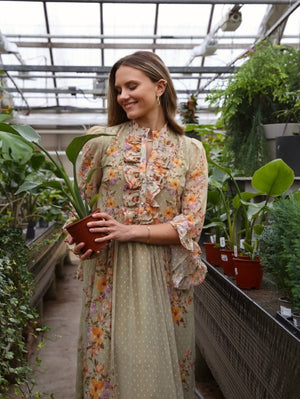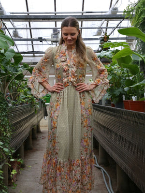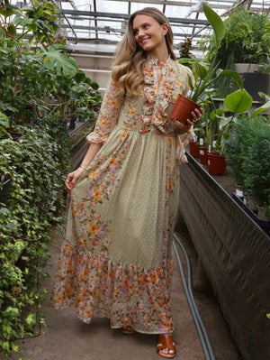 Joy Long Dress utstråler bohemsk eleganse med sitt livlige blomstermønster og flytende silhuett. Denne maxikjolen har intrikate volangdetaljer langs fronten og ermene, som gir tekstur og sjarm. Det myke, luftige stoffet gjør den til et ideelt valg for spesielle anledninger, spesielt bryllup og utendørs feiringer.