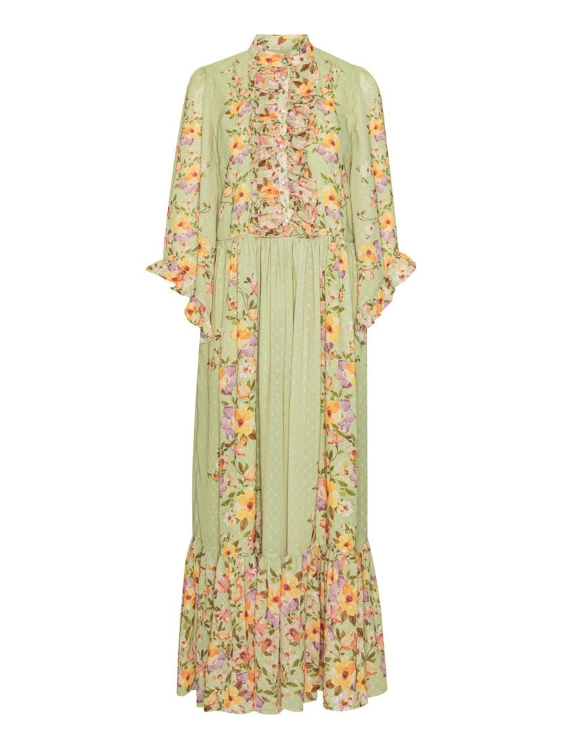 - Egenskaper: Blomstermønster, volangdetaljer, maxi-lengde