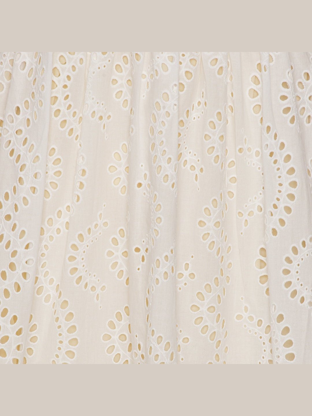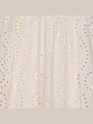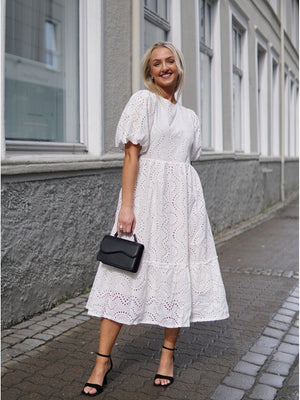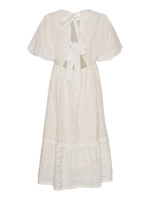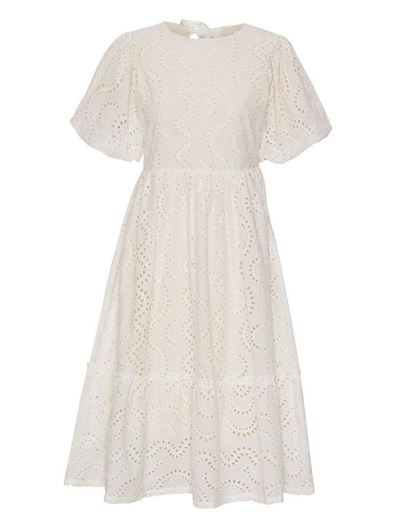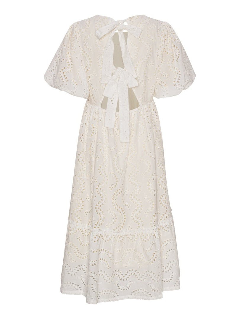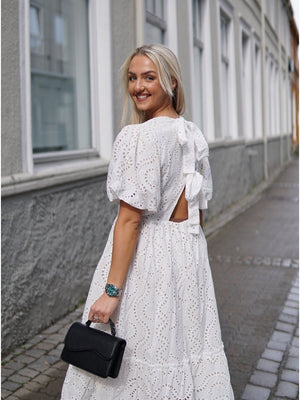 Lola Dress kommer i 100% bomull med ballongermer og A-fasong. Den er løs i passformen så den er utrolig behagelig å ha på. Kjolen er åpen bak med to knytebånd, hvor det ene knytebåndet dekker bh-stroppen. Kjolen er dekket med broderie anglaise broderi og er full av små detaljer. Kommer i lang og kort.