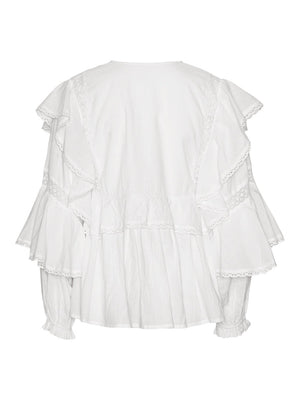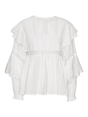 Miri Bluse er en vakker kombinasjon av bohemsk eleganse og håndverksinspirert design, laget av 100 % lett bomull. Blusen har intrikate blondedetaljer, delikate pintuck-sømmer og lagdelte volangdetaljer på ermene, som gir et romantisk og feminint uttrykk. Den avslappede silhuetten kompletteres med knyting i ryggen, noe som gjør den både stilig og behagelig.