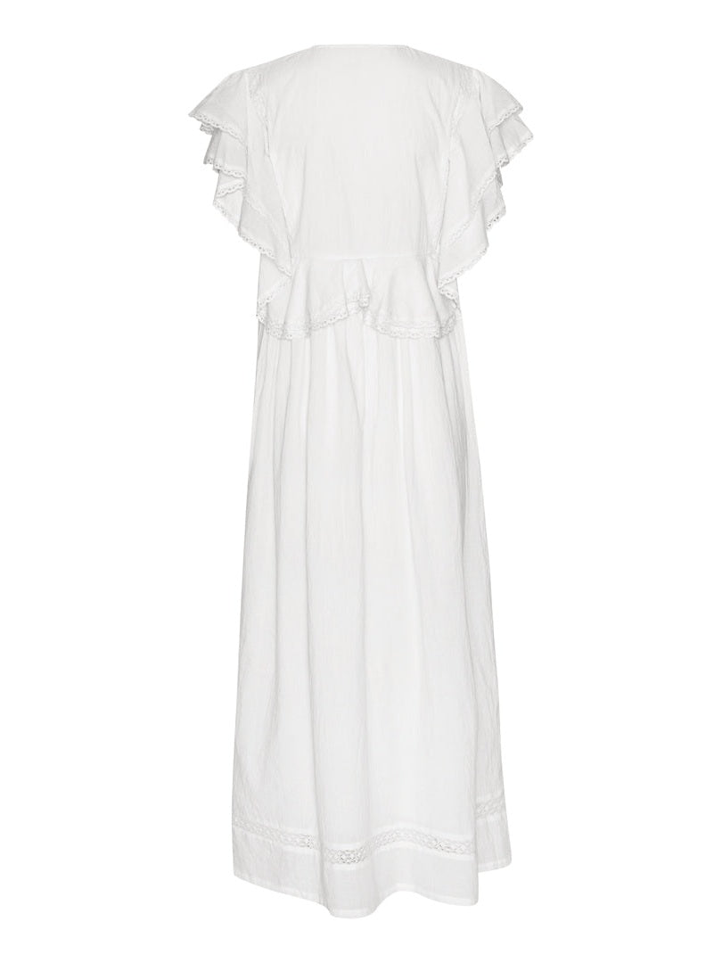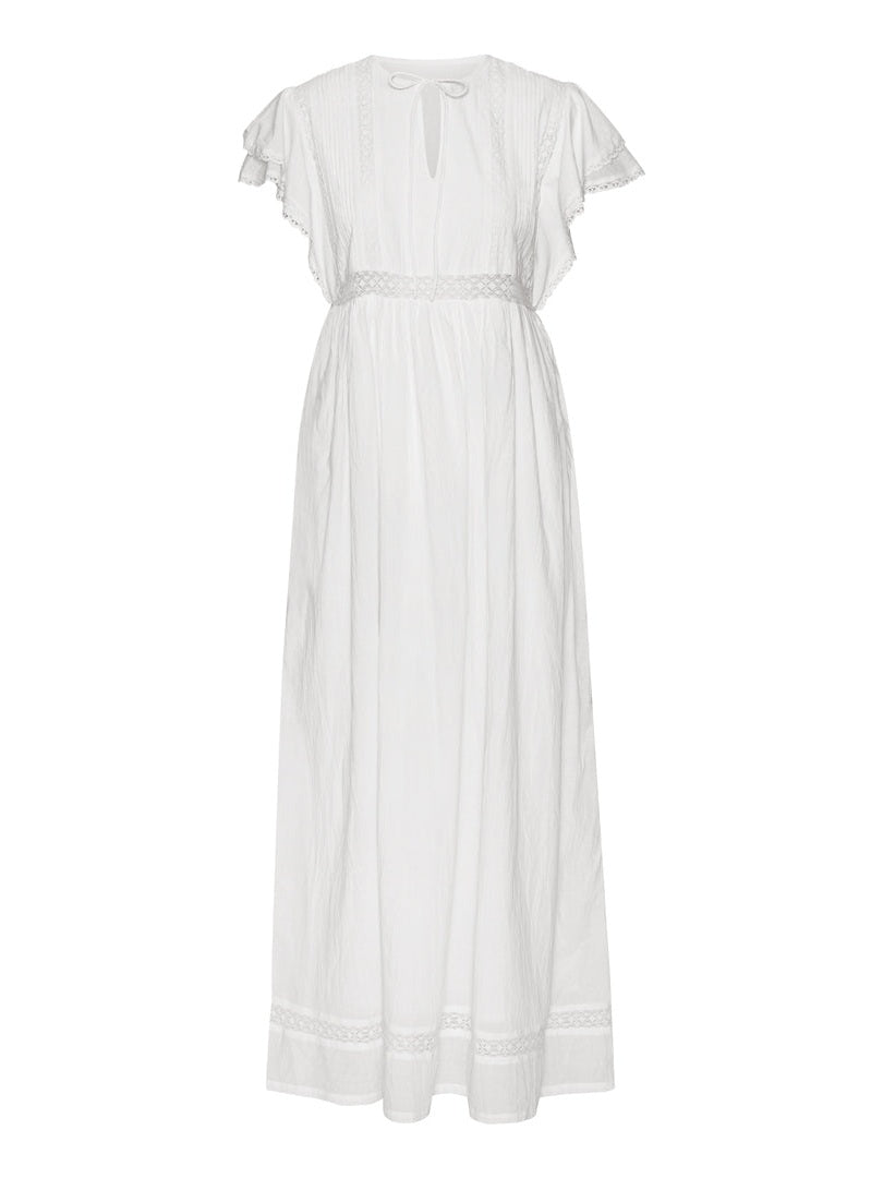 Egenskaper: Intrikate blondedetaljer, flagrende ermer, knyting i ryggen, maxilengde