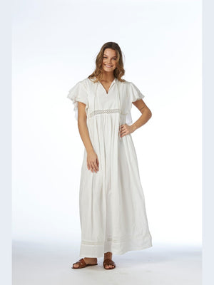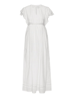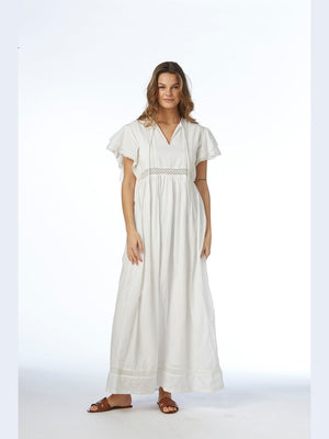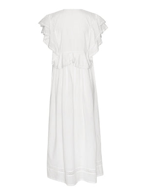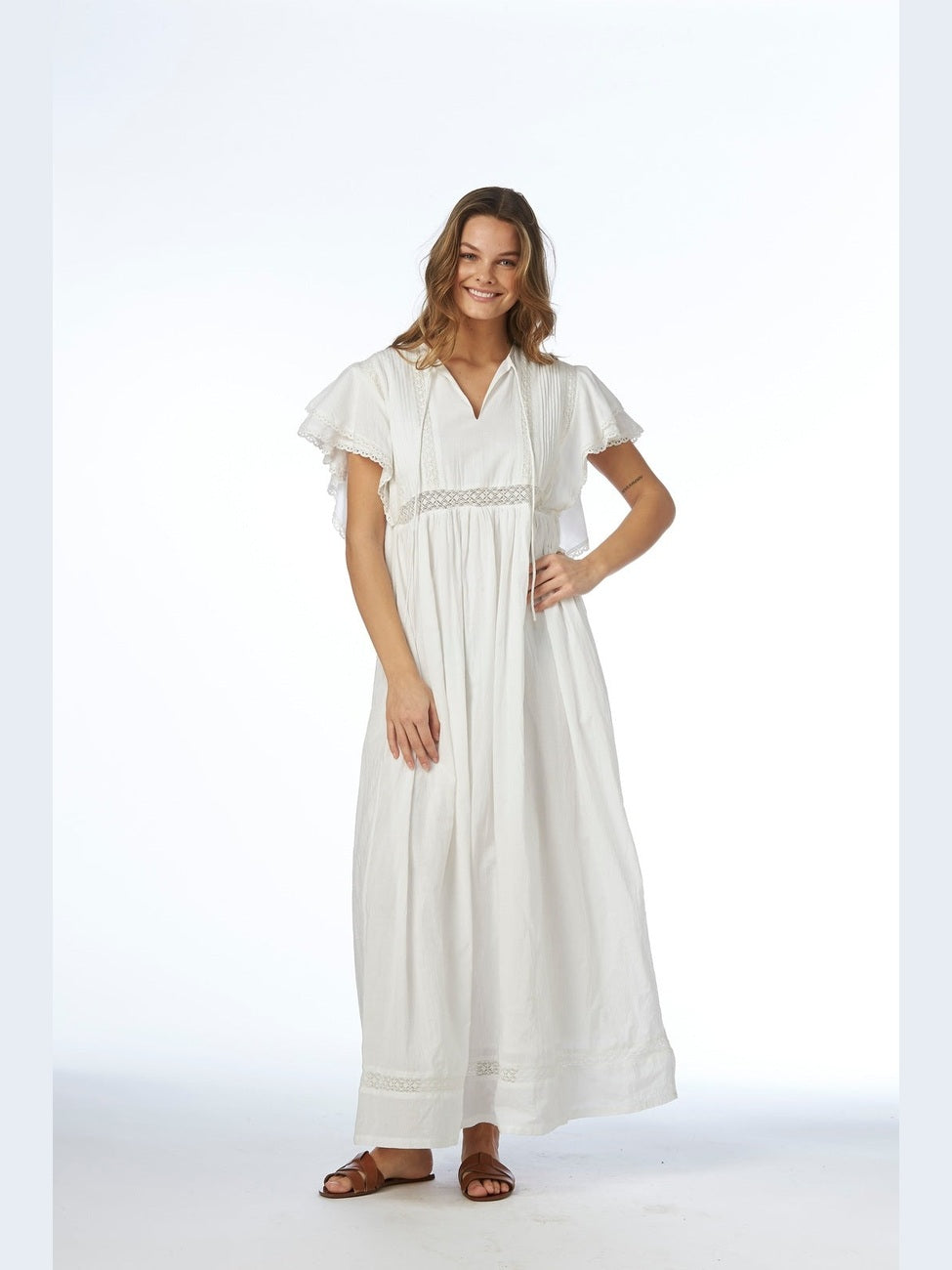 Miri Lang Kjole fanger tidløs bohemsk eleganse med sin luftige silhuett og delikate detaljer. Denne maxikjolen er laget av 100 % lett bomull og har intrikate blondeaksenter og flagrende ermer, noe som skaper et romantisk og feminint uttrykk. Den innsvingede midjen fremhever figuren, mens knytingen i ryggen gir en ekstra touch av allsidighet. Perfekt for varme sommerdager eller spesielle anledninger – denne kjolen utstråler uanstrengt eleganse.