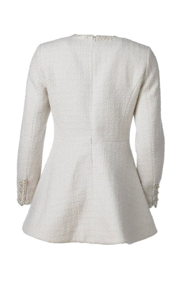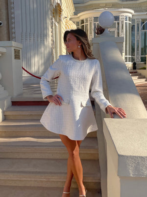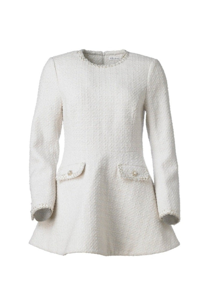Solange Tweed-kjolen er perfekt for høytiden, og tilbyr en sofistikert A-formet silhuett med intrikate detaljer. Laget i tweed, gjør det elegante designet, dekorative lommene og den fremhevede halsen den til et ideelt valg for festlige sammenkomster og elegante feiringer.