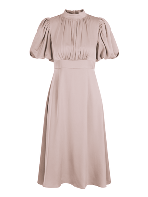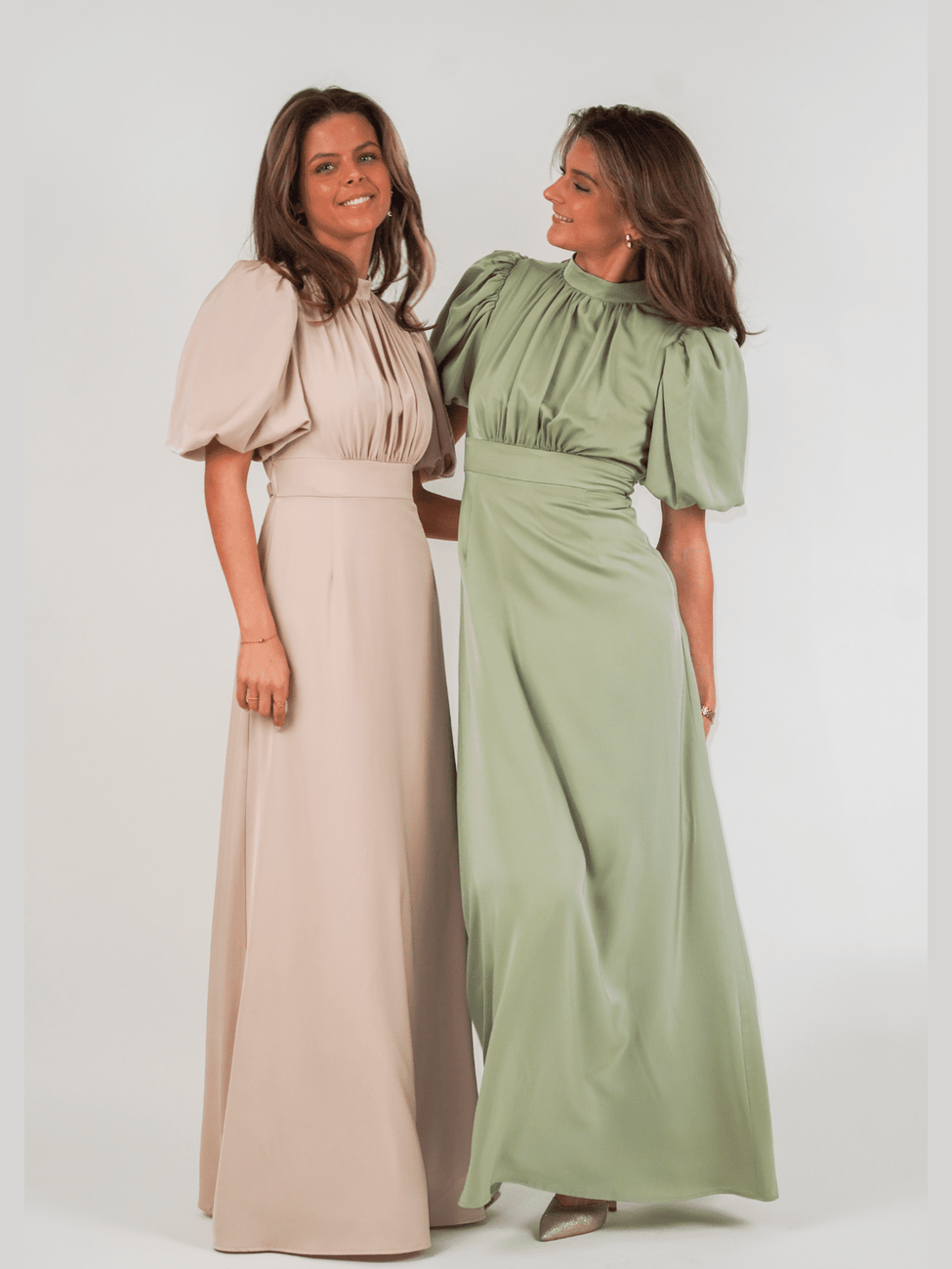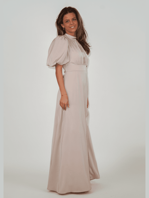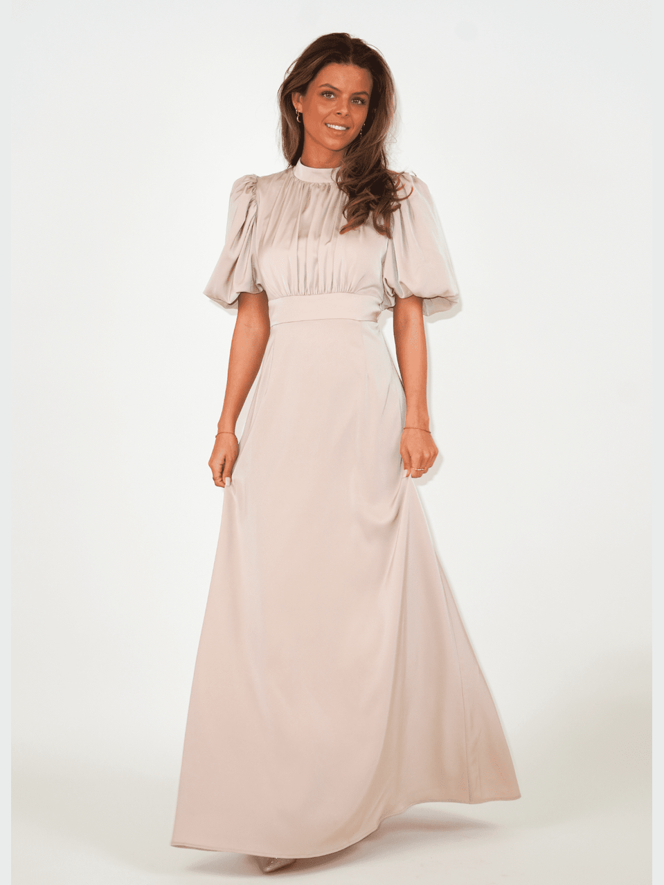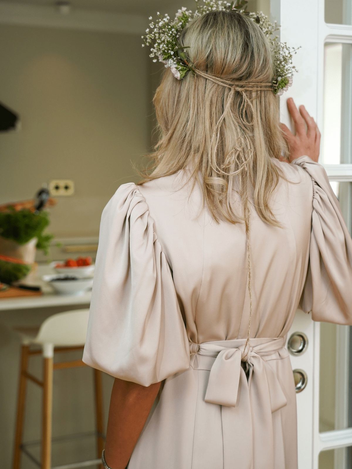 Puffede ermer med lett volum, delikat rynking over brystet og et avtagbart belte fremhever midjen på en vakker måte. Du styler den slik du ønsker. Skjult glidelås bak og en liten splitt gir en sømløs finish. Den myke underkjolen sørger for komfort hele dagen og hele kvelden.