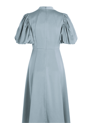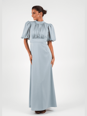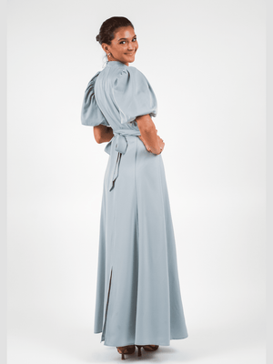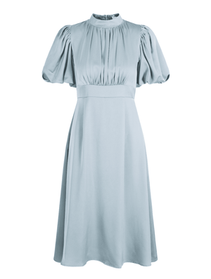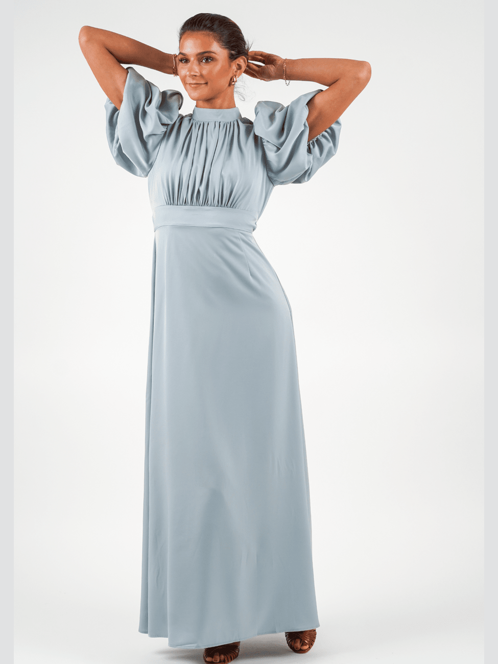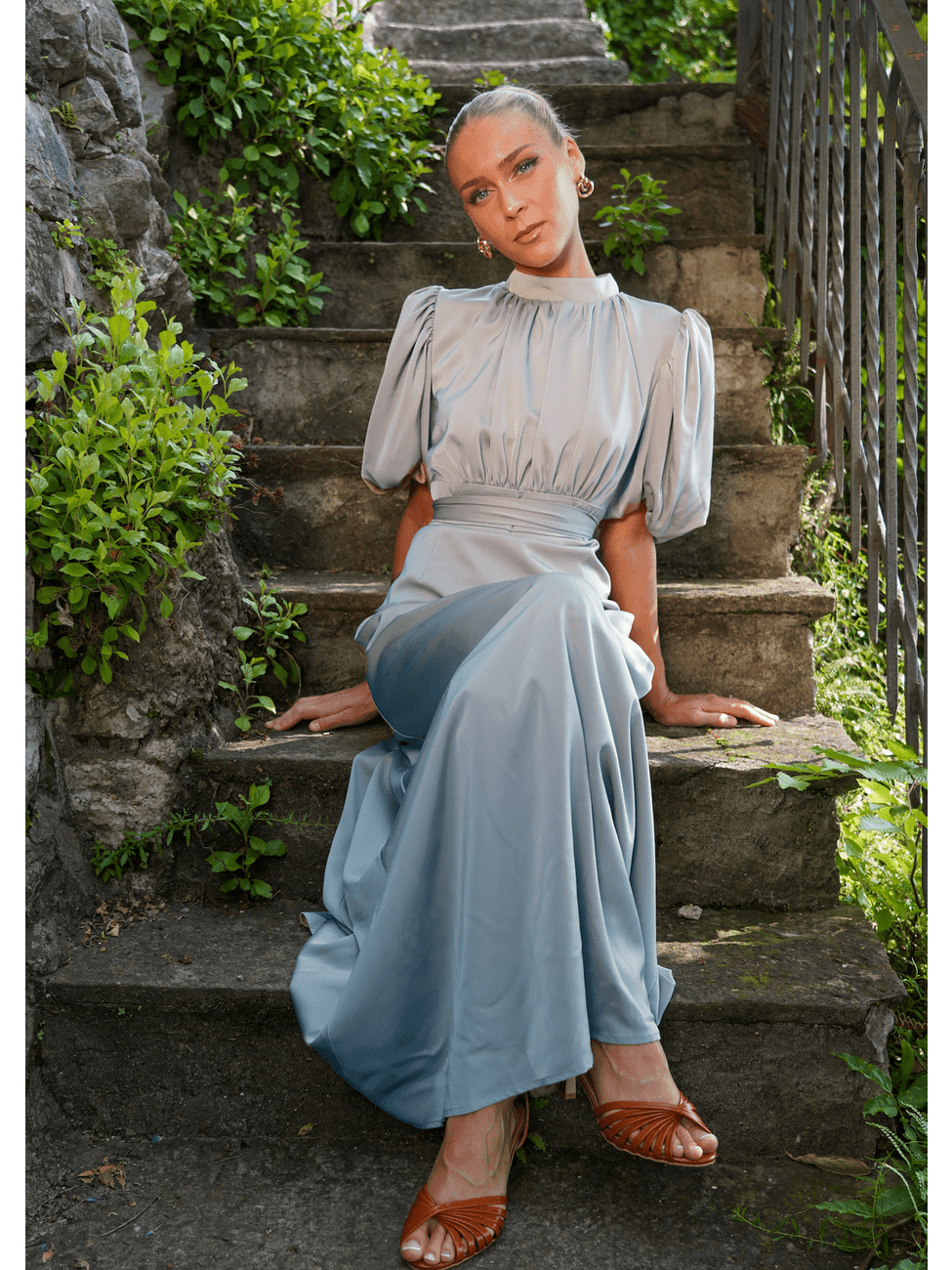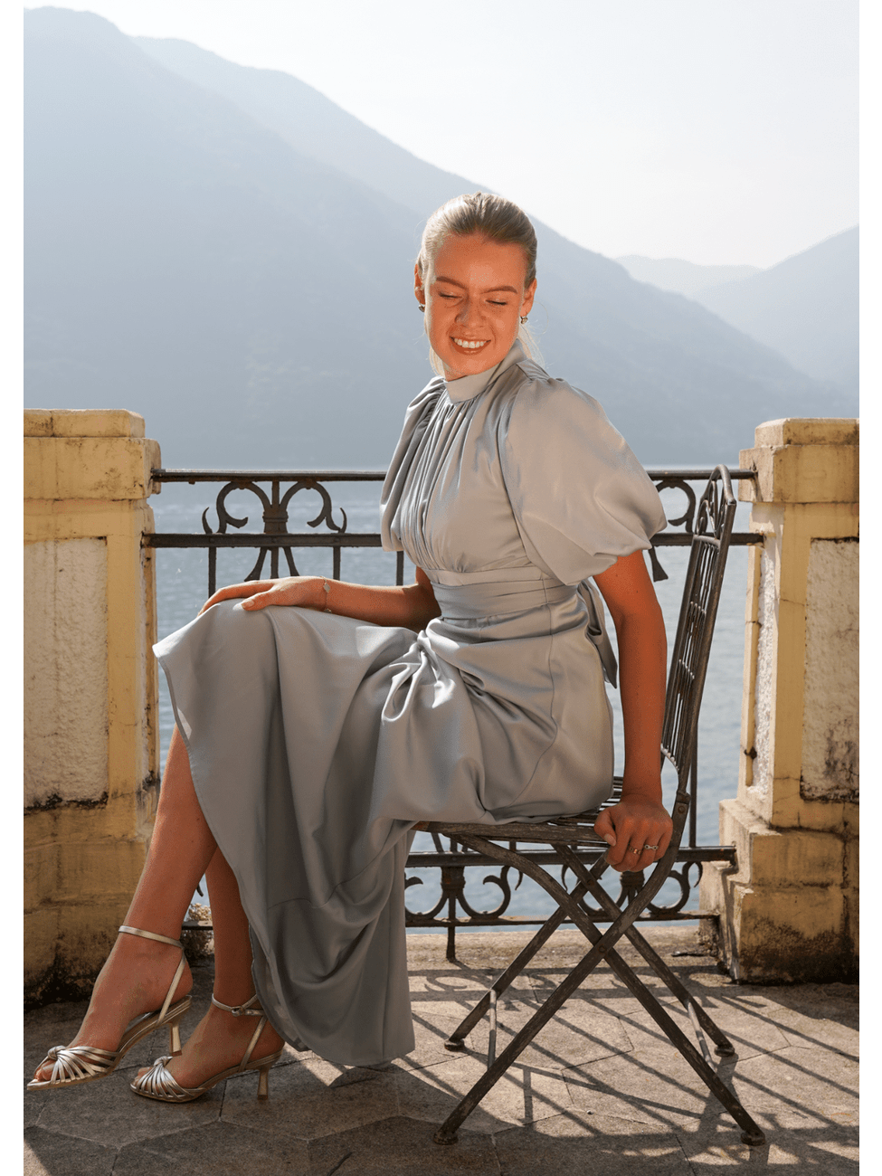 Puffede ermer med lett volum, delikat rynking over brystet og et avtagbart belte fremhever midjen på en vakker måte. Du styler den slik du ønsker. Skjult glidelås bak og en liten splitt gir en sømløs finish. Den myke underkjolen sørger for komfort hele dagen og hele kvelden.