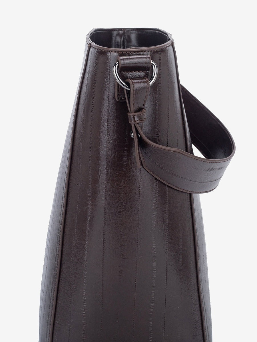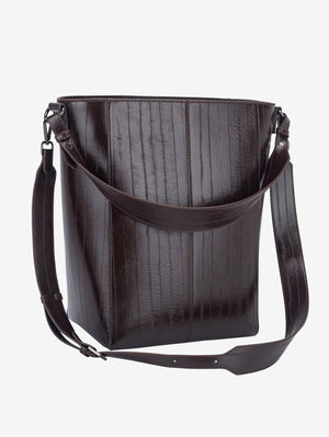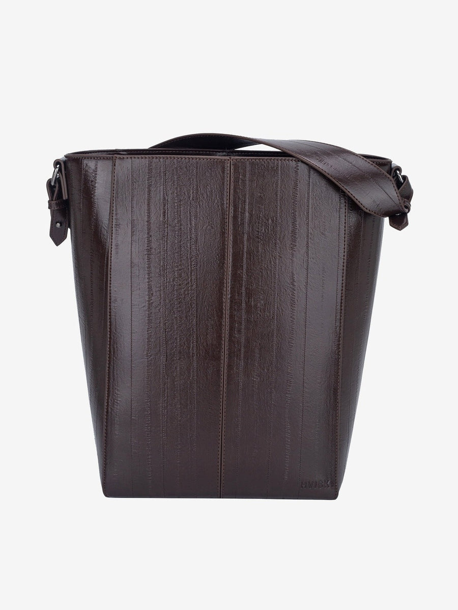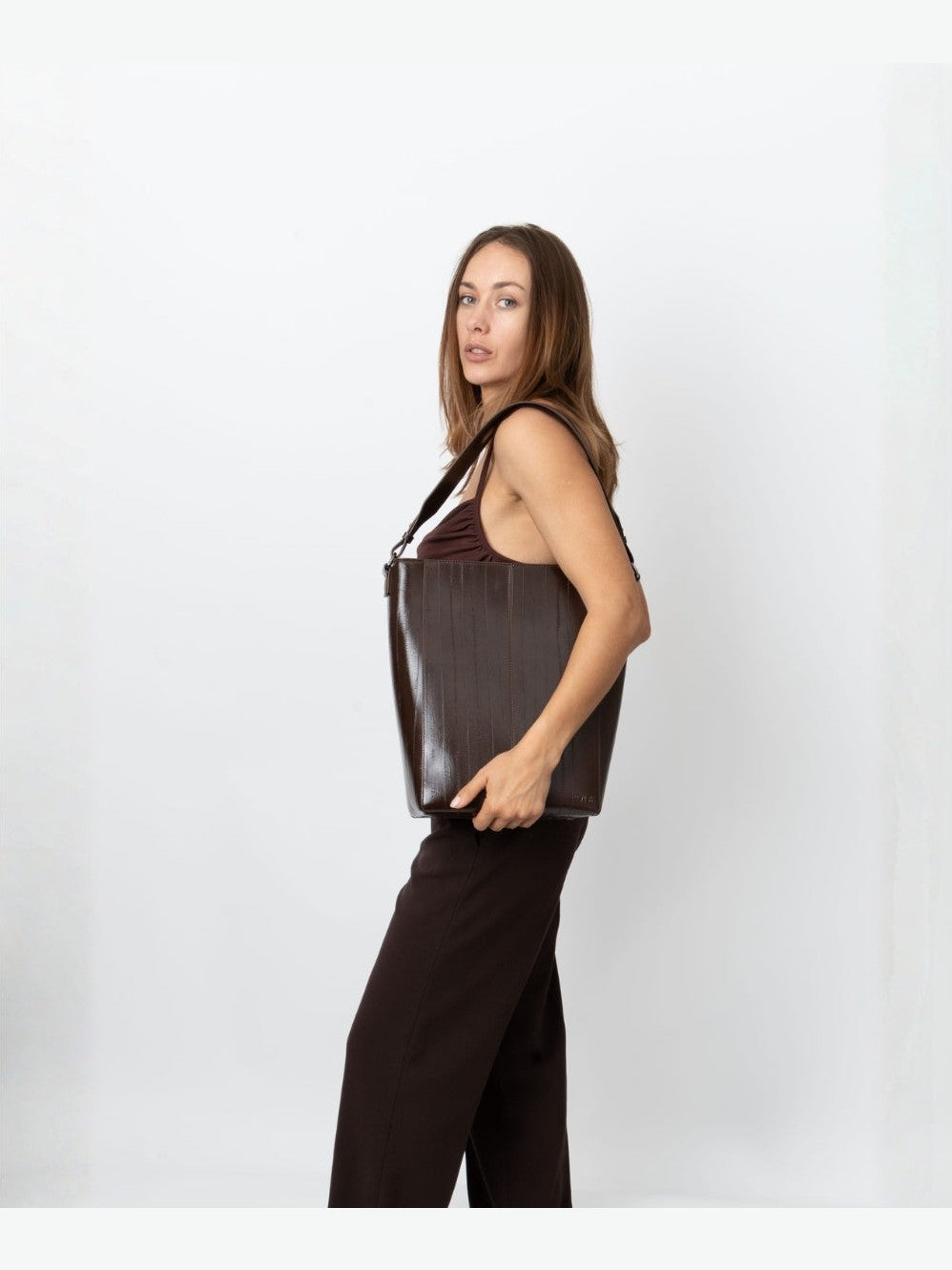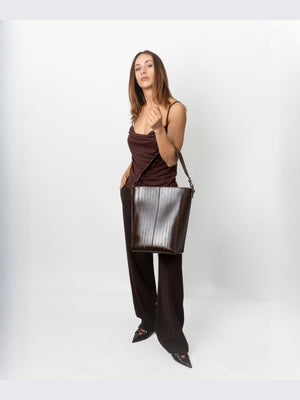 Bucket bag with bag shoulder strap, a long adjustable strap and zip closure. The bag contains one compartment with two inner pockets and one inner zip pocket. H35,5 cm x W25 cm x D17,5 cm