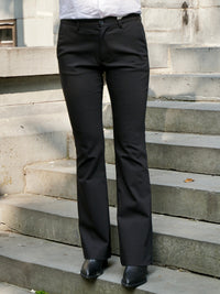 "Alice Flare Bukse - Black". Elegant dressbukse i klassisk sort farge med god stretch. Buksen er middels høy på midjen og har flatterende passform med lange ben som svinger deg ut ved leggene. Stikklommer i sidene og lukkes med glidelås og knapp. Laget av en behagelig blanding av bomull, polyamid og elastan.