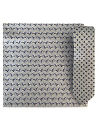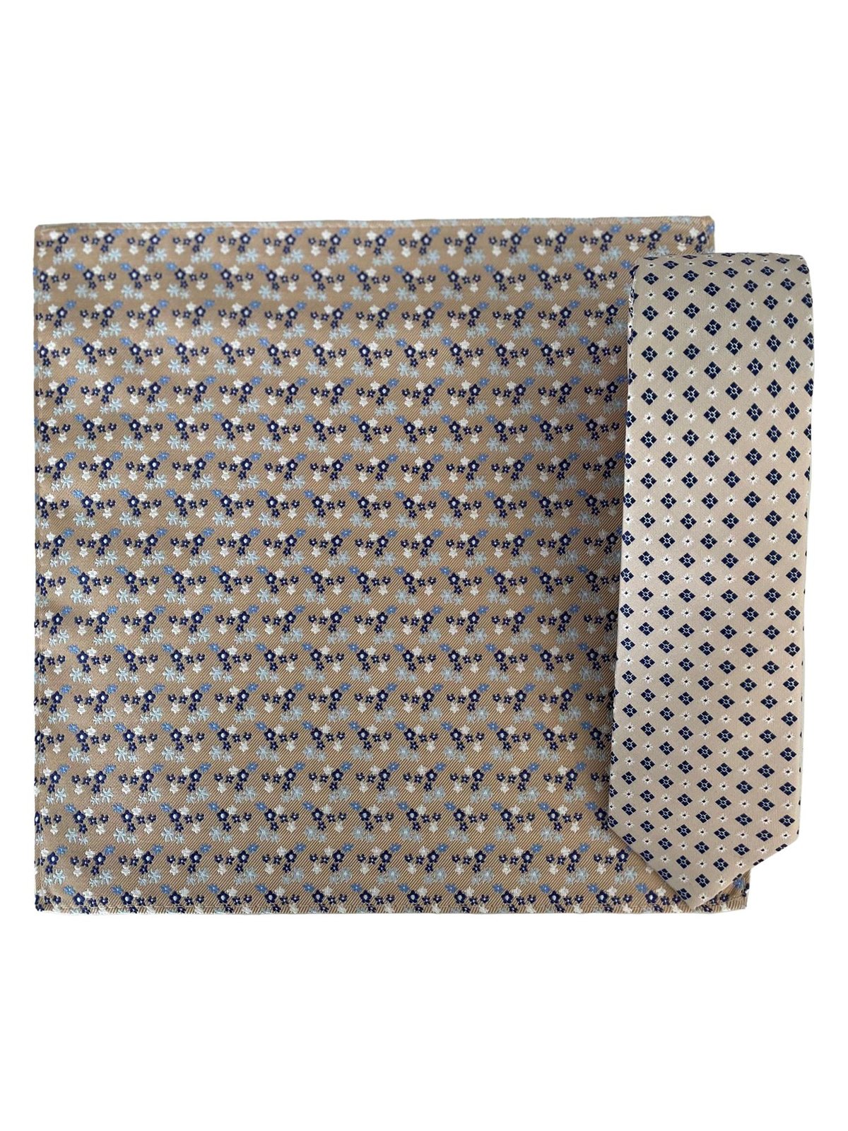 Dette stilige tilbehørsettet består av et slips og et lommetørkle som begge har en elegant beige farge. Begge deler er prydet med et sofistikert mønster i blå toner, noe som gir et klassisk og luksuriøst preg. Slipsen har en pen og formell utforming, mens lommetørkleet er perfekt tilpasset slik at det enkelt kan stikkes i brystlommen for en stilfull look.
