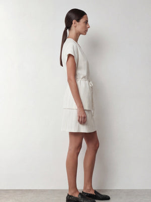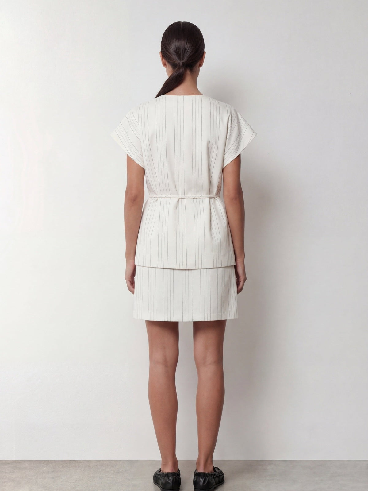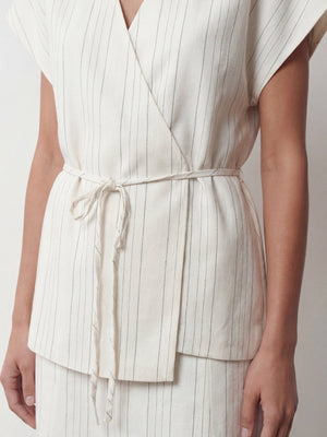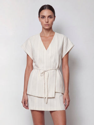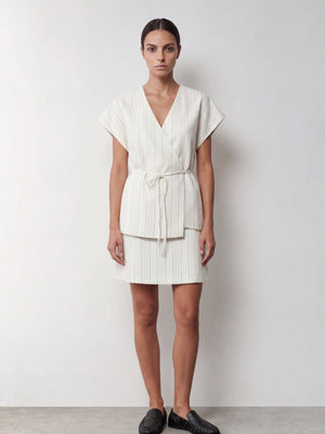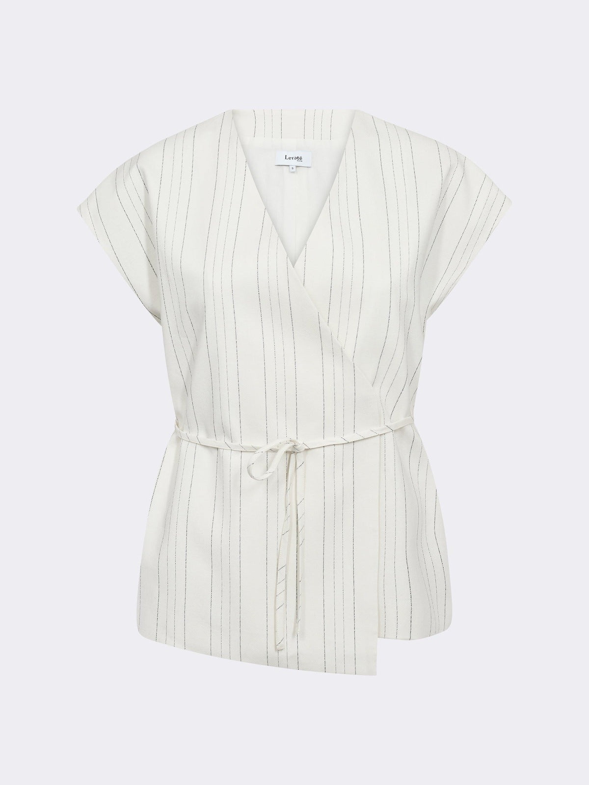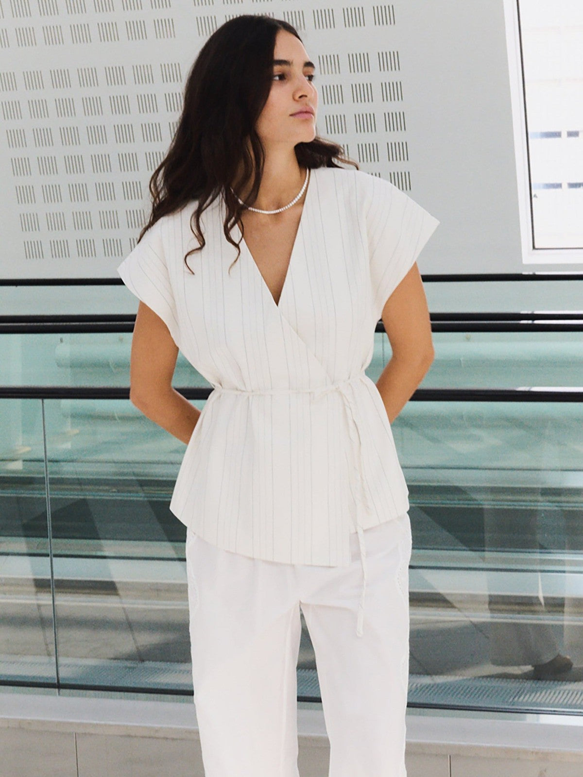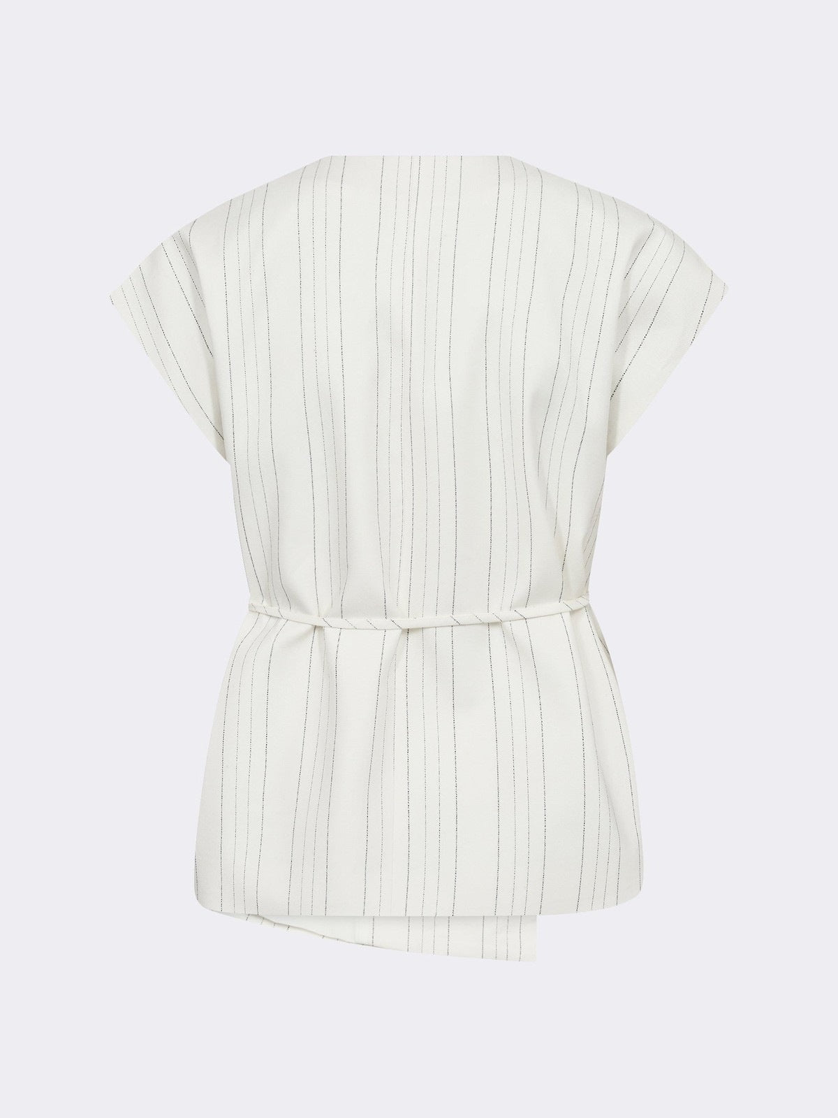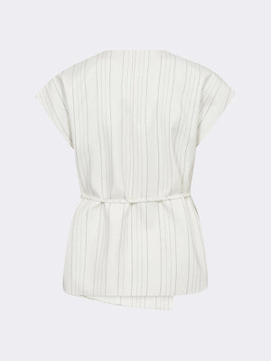 Denne blusen har en delikat hvit farge med subtile striper som gir et elegant preg. Den har et kortermet design med løs passform, noe som gjør den behagelig og luftig. V-halsen bidrar til et feminint uttrykk, mens belte med knyting fremhever midjen på en flatterende måte.