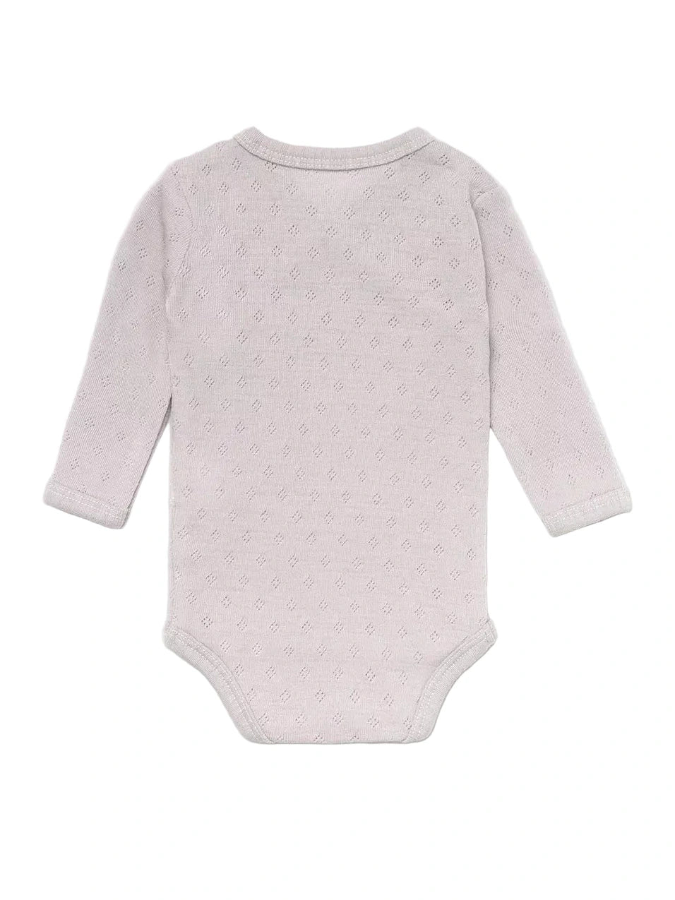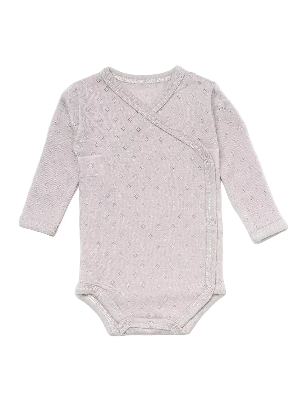 En tynn og luftig babybody til de aller minste, laget i den mykeste merinoullen. Omslag foran med trykknapper langs siden gjør at du slipper å trekke bodyen over babyens hode. Pointelle-mønsteret gjør bodyen spesielt godt egnet for små babyer, siden den er lett, pustende og aldri blir for varm takket være ullfibrenes naturlige temperaturregulerende egenskaper. Denne pointelle-bodyen passer perfekt sammen med matchende pointelle-lue og babybukse.