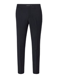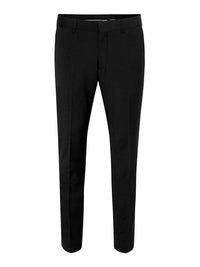 Dette er en elegant dressbukse for menn i en klassisk svart farge. Den smale passformen gir en moderne silhuett, perfekt for å fremheve en strømlinjeformet look. Buksen har en lengde som faller pent over skoene, med detaljer som beltehemper og diskrete baklommer med knapper.