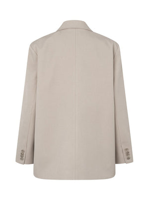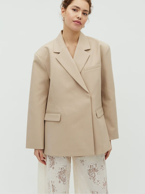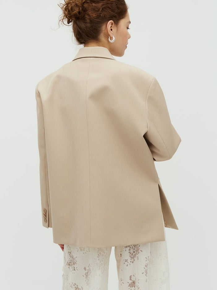 Amariella blazer fra MbyM er en moderne og sofistikert blazer i en tidløs beige nyanse som løfter enhver garderobe. Den har en avslappet, lett oversized passform med rette linjer og markerte skuldre som gir et elegant og selvsikkert uttrykk. Blazeren er designet med klassisk slag, enkel knappelukking i front, brystlomme og klaffelommer, samt dekorative knapper nederst på ermene. Den rene baksiden med midtsøm understreker den minimalistiske og skandinaviske stilen.