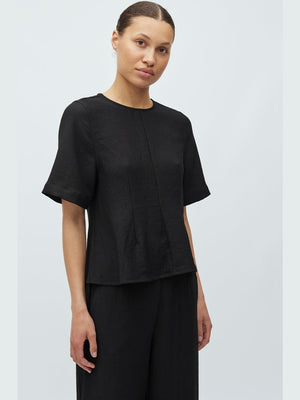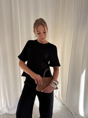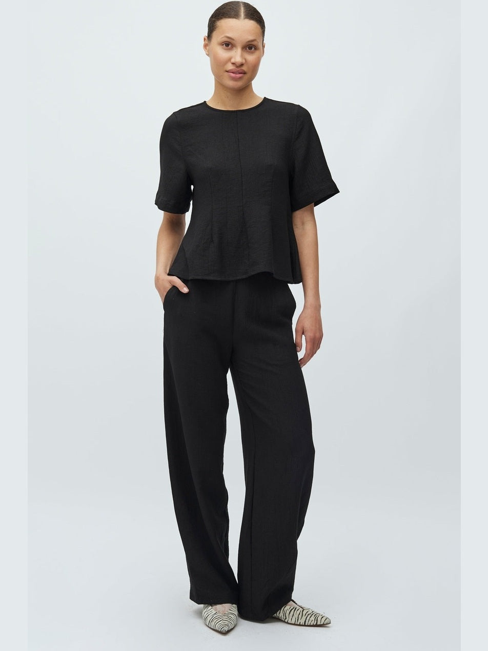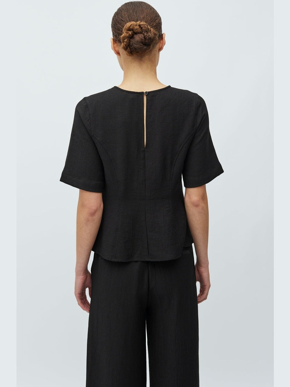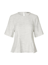 Kaely Topp er en feminin og moderne bluse fra mbyM, designet for deg som ønsker en stilren, men trendy look. Den har korte ermer, rund hals og en flatterende peplum-fasong som markerer midjen og gir en elegant silhuett. Den lette, strukturerte kvaliteten i melert grå gjør den perfekt til både vår- og sommersesongen.