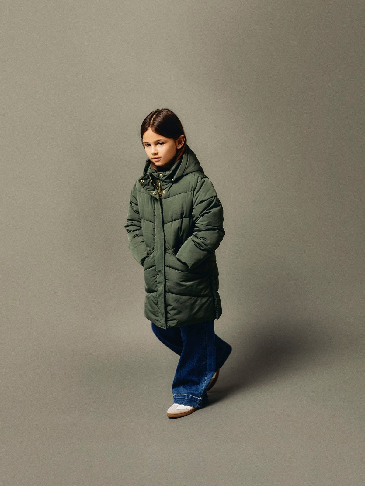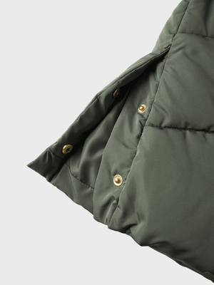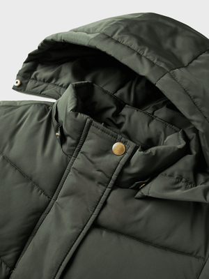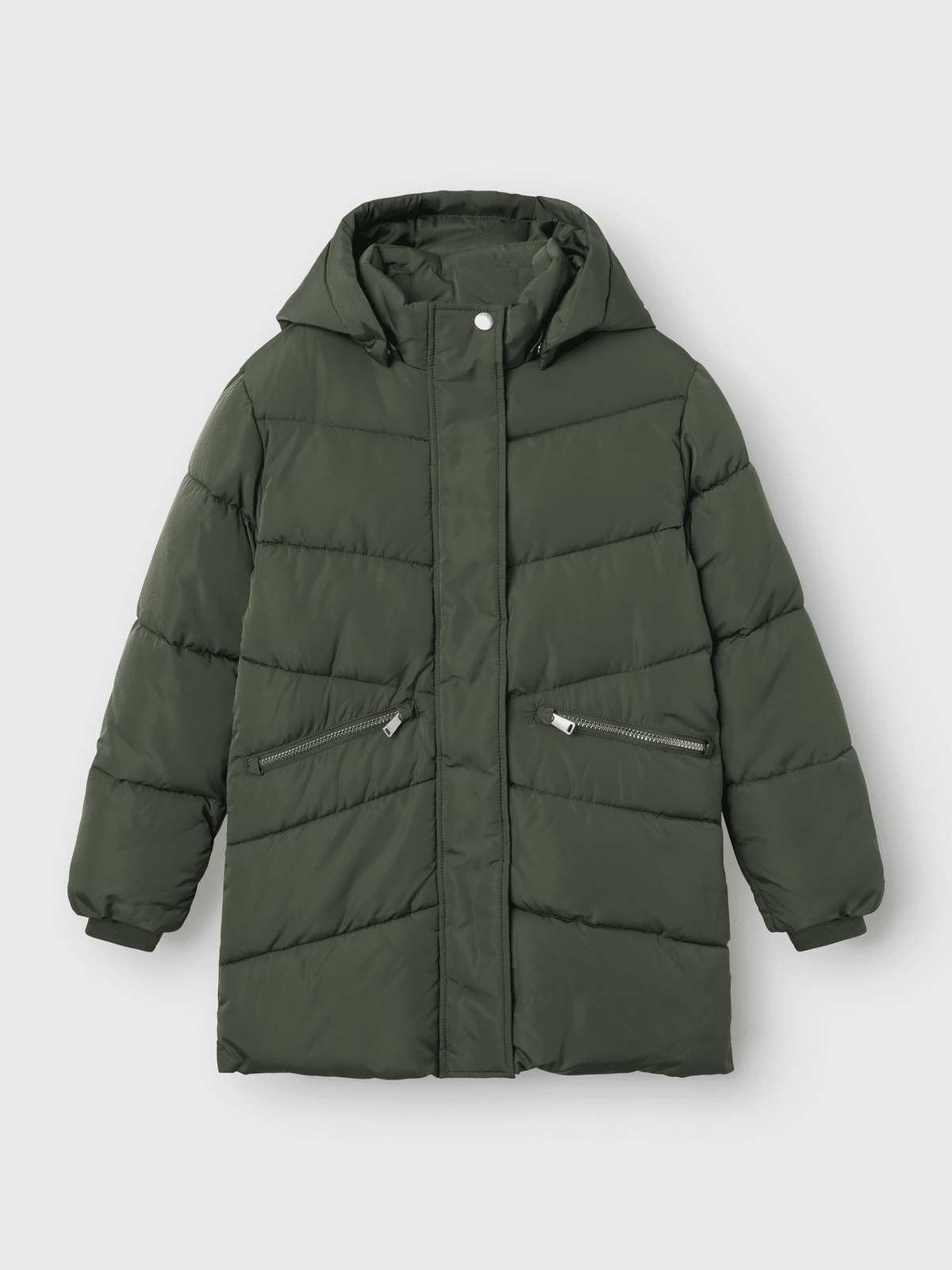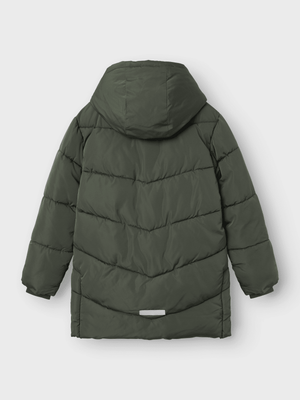 Gjør barnet ditt klart til enhver årstid med trendy yttertøystyles som tilfører farge og et kult preg. NAME IT har produsert yttertøy av høy kvalitet siden 1986, med spesielt fokus på funksjonalitet og sikkerhet. Vi holder oss oppdatert på aktuelle motetrender, som vi forvandler til komfortabelt yttertøy for barn. - Produkttype : Pufferjakke - Hals : Avtakbar hette - Erme : Lange ermer - Mansjetter : Ribbemansjetter - Lukking : Glidelåslukking - Lommer : Frontlommer med glidelås - Lengde/størrelse : Lang - Fyll : Middels isolasjon - Detaljer : Dekorative refleksdetaljer, Avtakbar hette for sikkerhet, Stormklaff for å forhindre at vinden trenger inn, Glidelåsbeskytter for å hindre at glidelåsen tar tak i huden - Vask/finish : Den vannavstøtende behandlingen BIONIC FINISH® ECO betyr at fluorstoffer ikke har blitt brukt til å gjøre produktet vannavstøtende , PFAS-FRI – våre produkter inneholder ikke fluorforbindelser