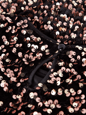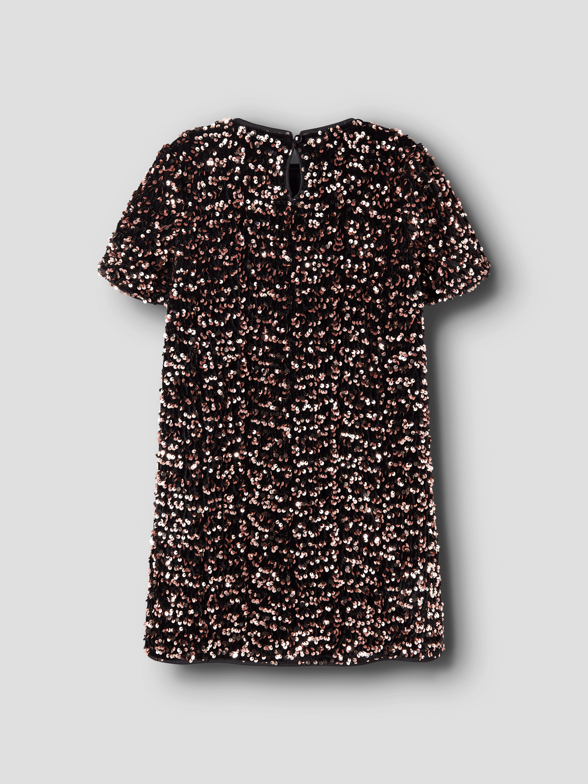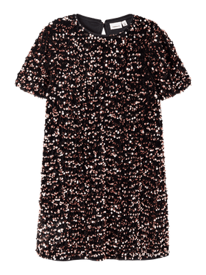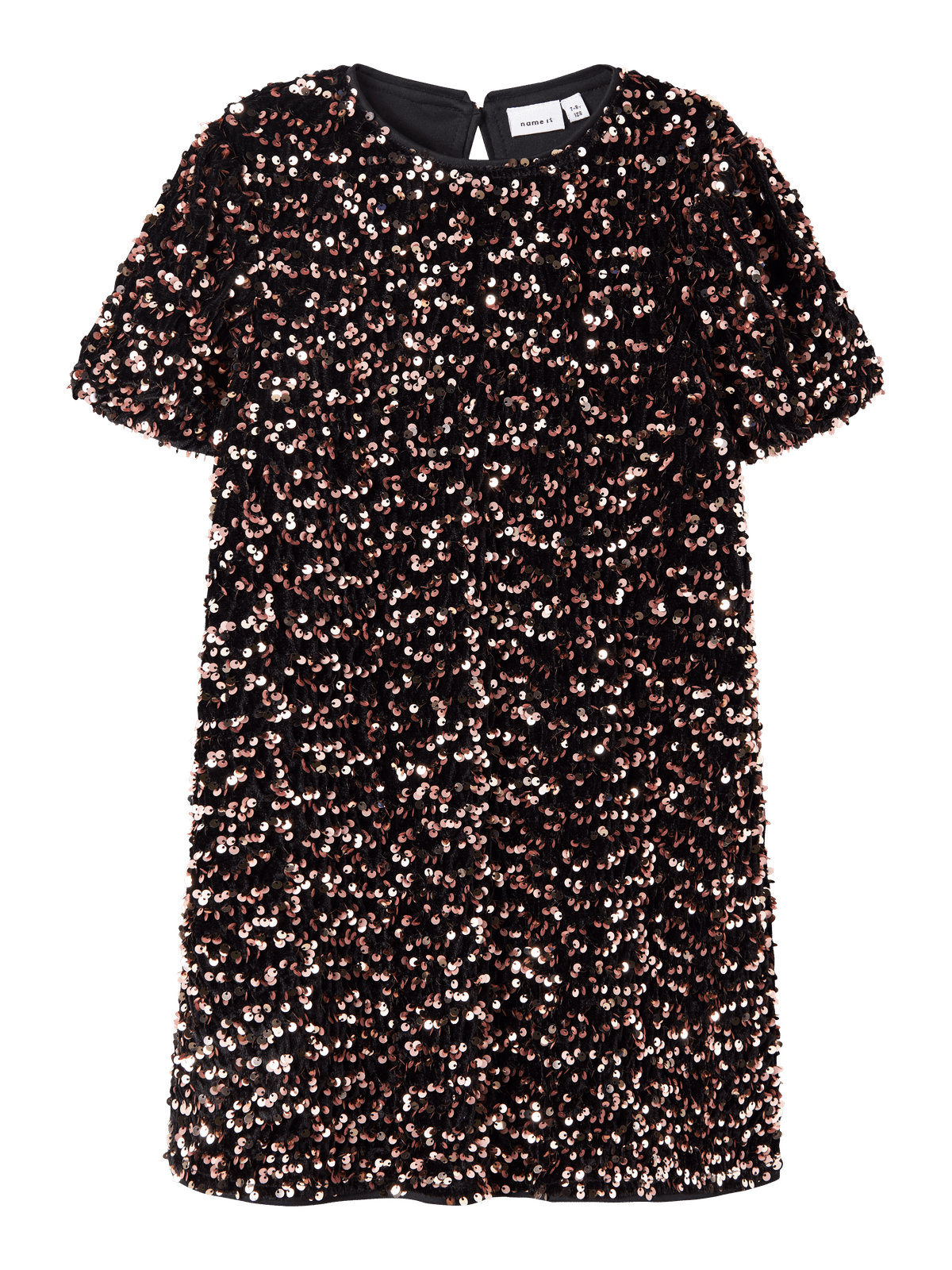 Gjør barnet ditt klart til enhver festlig begivenhet eller spesielle anledning hele året med morsomme og glamorøse feststyles. Vevd stoff har et tydelig kryssmønster og en lett strukturert overflate for et rent og klassisk look. - Produkttype : Kjole - Hals : O-hals - Erme : Korte ermer - Lukking : Knapp og hempefeste - Lengde/størrelse : Kort - Detaljer : Paljettdetalj - Passform : Regular Fit