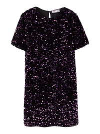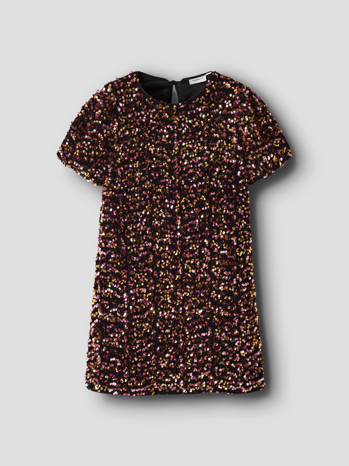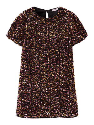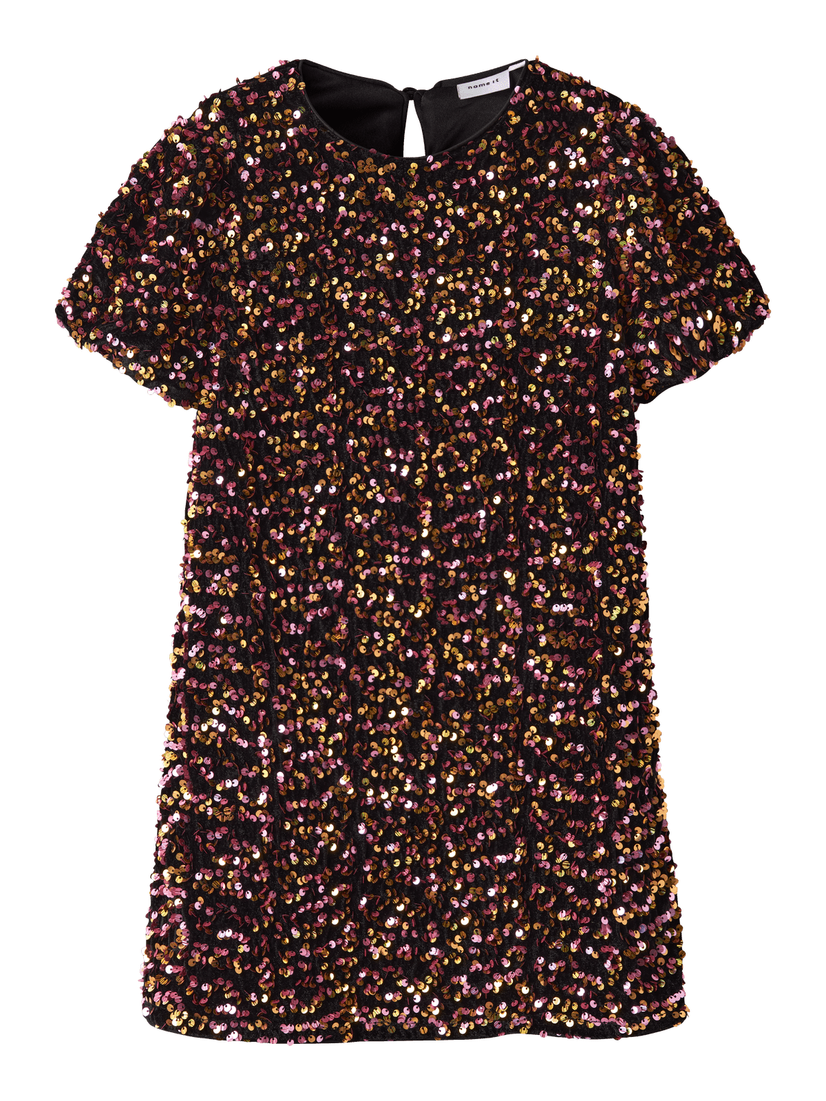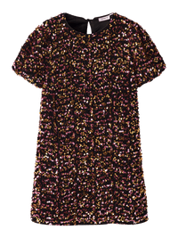Gjør barnet ditt klart til enhver festlig begivenhet eller spesielle anledning hele året med morsomme og glamorøse feststyles. Vevd stoff har et tydelig kryssmønster og en lett strukturert overflate for et rent og klassisk look. - Produkttype : Kjole - Hals : O-hals - Erme : Korte ermer - Lukking : Knapp og hempefeste - Lengde/størrelse : Kort - Detaljer : Paljettdetalj - Passform : Regular Fit