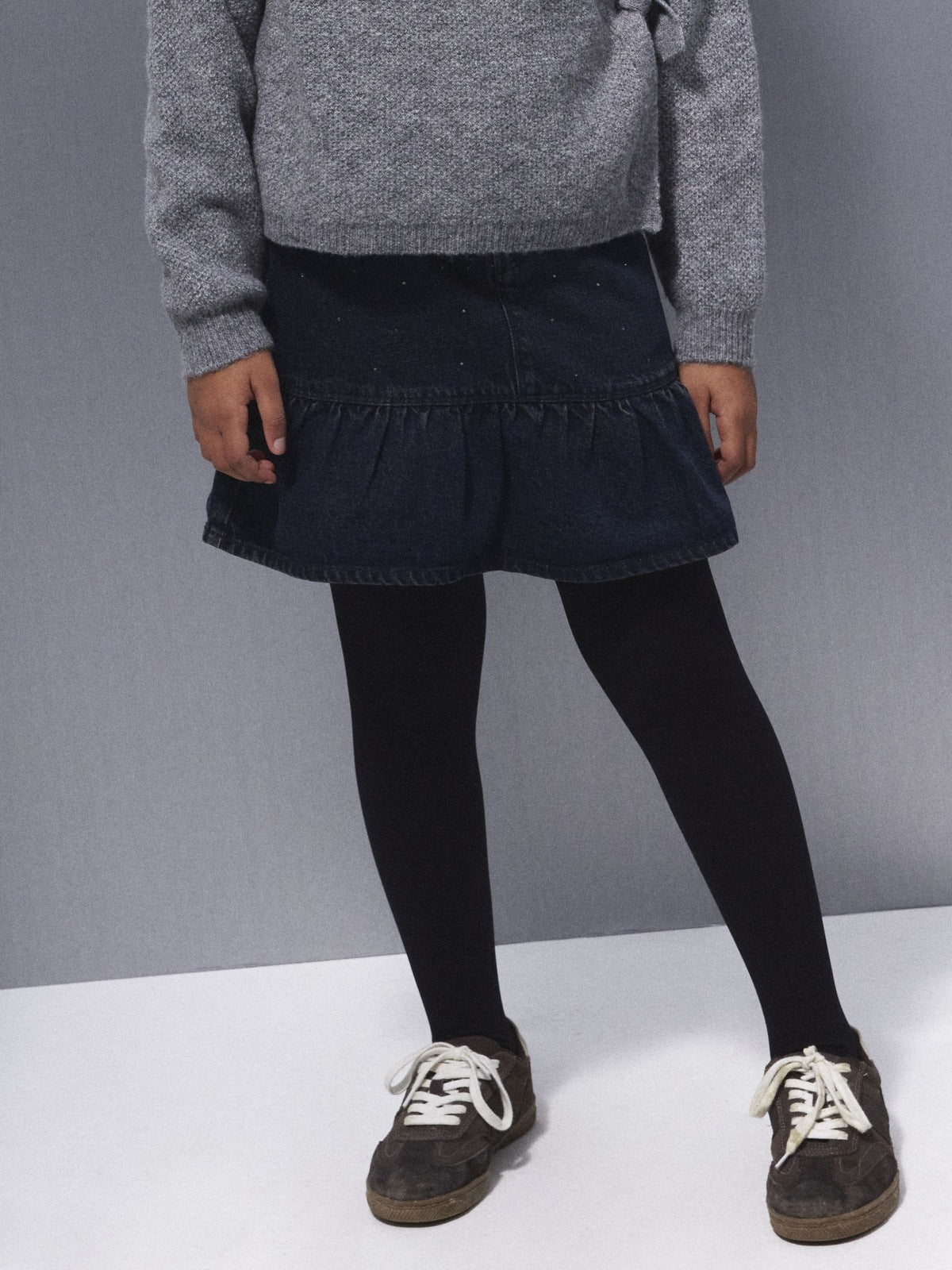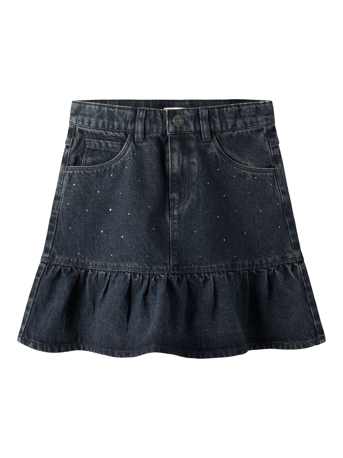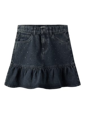 Gjør barnet ditt klart til enhver festlig begivenhet eller spesielle anledning hele året med morsomme og glamorøse feststyles. Denim er et slitesterkt vevd stoff som finnes i flere uttrykk for et unikt look. - Produkttype : Denimskjørt - Lukking : Krokknapp og glidelåsfeste - Lommer : Myntlomme, Forlommer - Detaljer : Justerbar midje, Rhinestones - Vask/finish : Diskré rifter