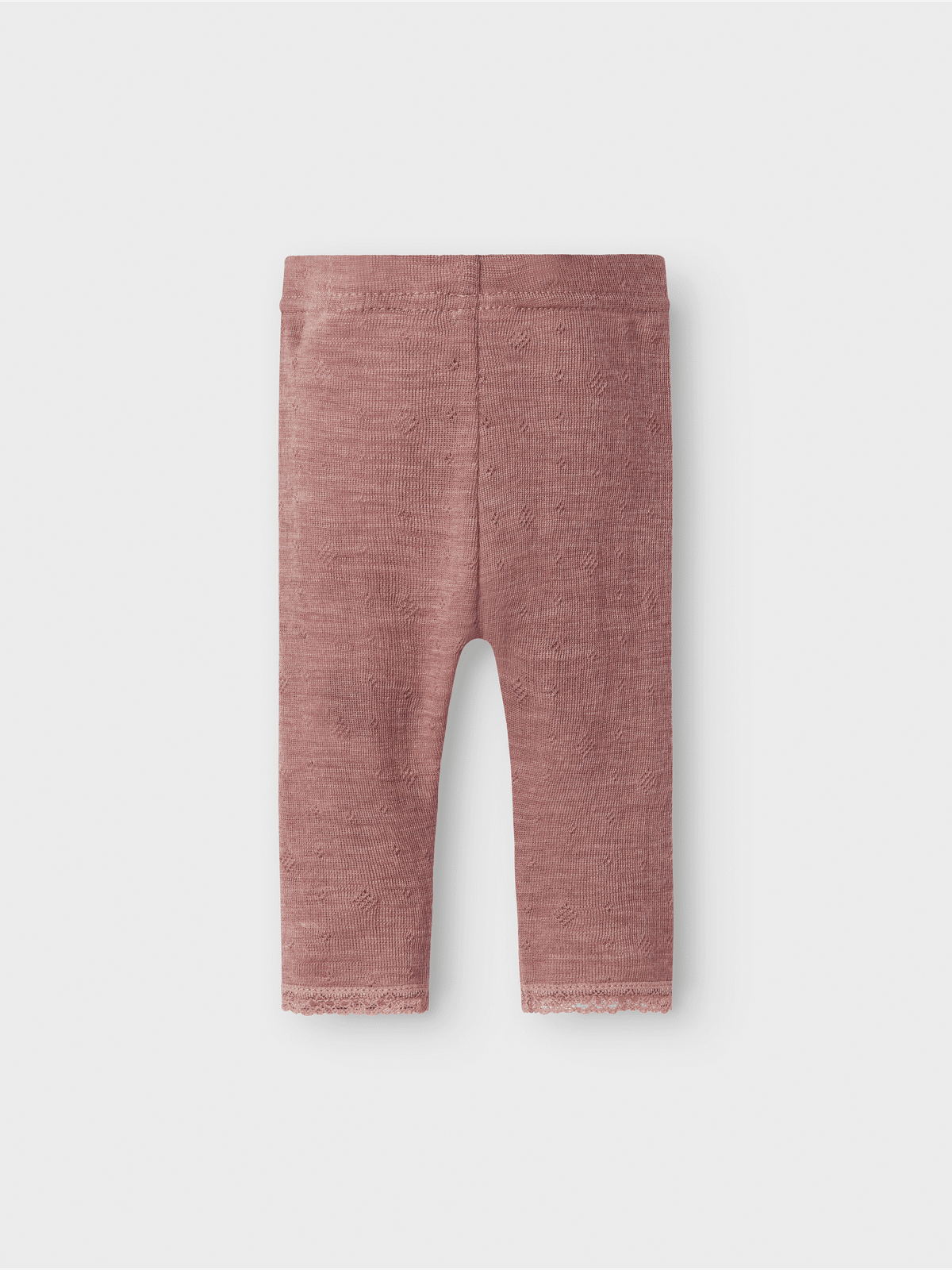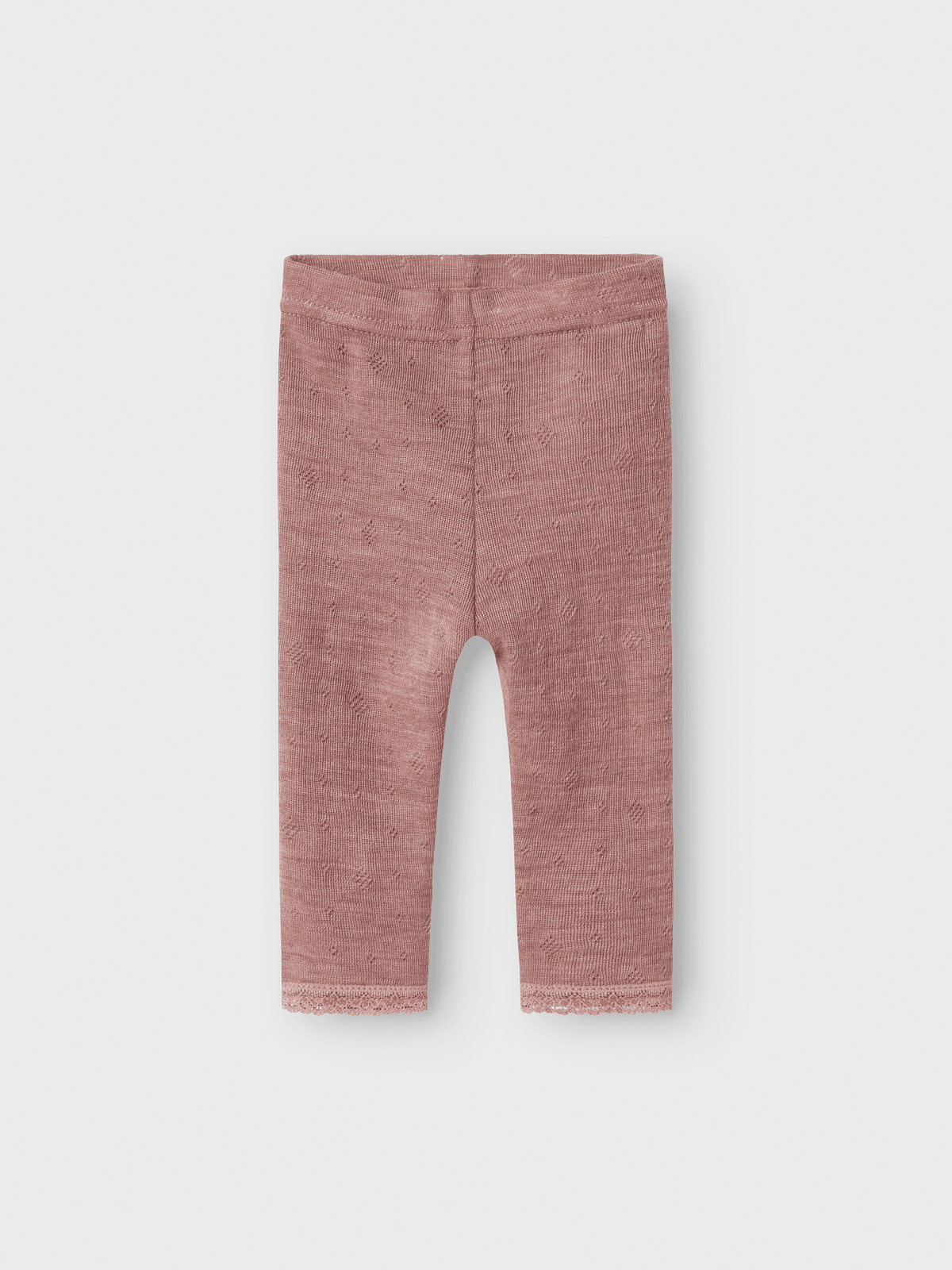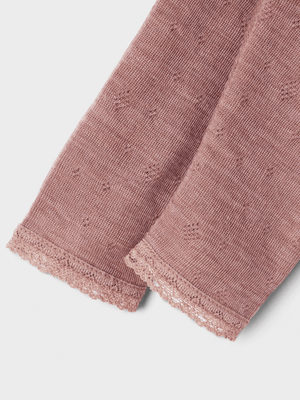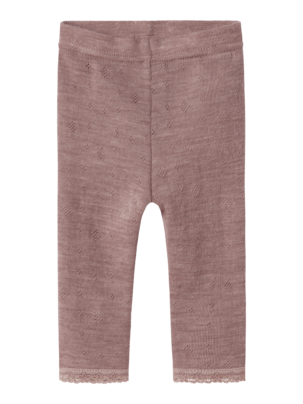 Legg til myke og behagelige ullstyles i barnets garderobe og sikre komfort hele året.. - Produkttype : Leggings - Høyde til midje : Middels høy midje - Ben detaljer : Blondekanter - Detaljer : Elastisk linning - Passform : Slim Fit Skall: 100 Ull (merinoull)