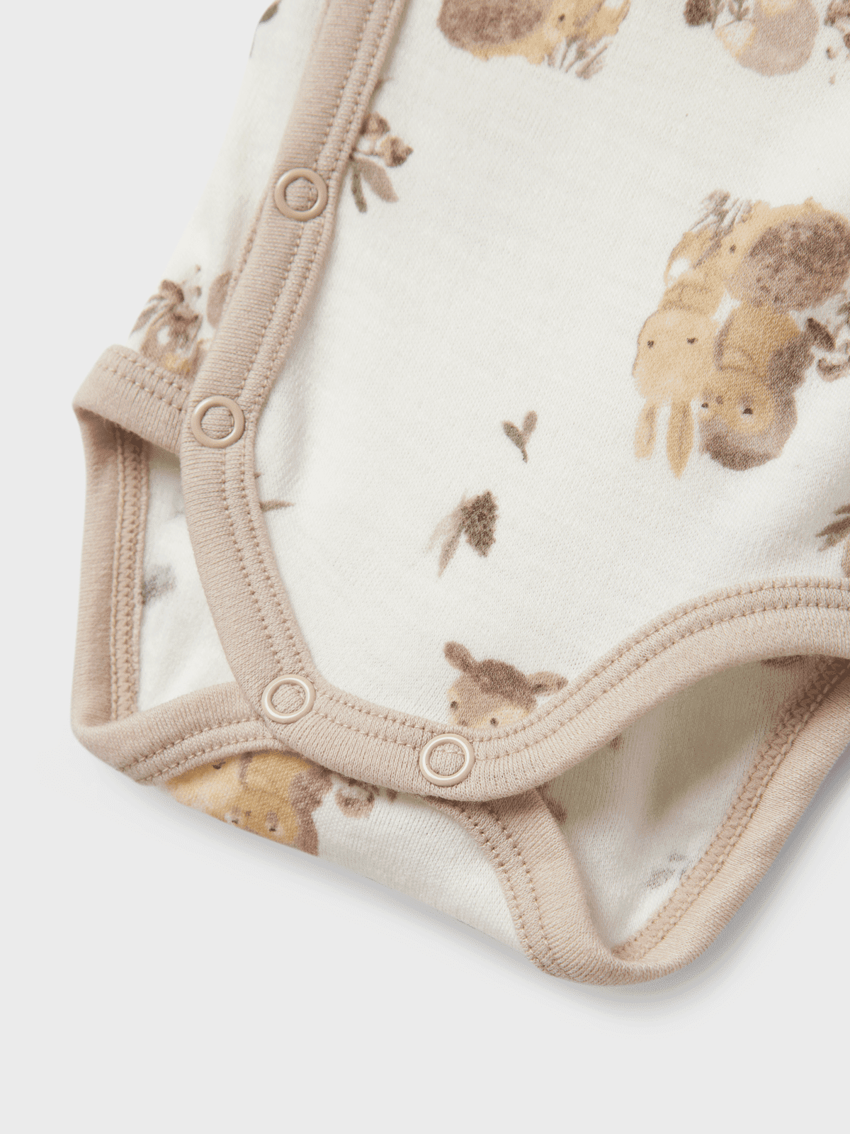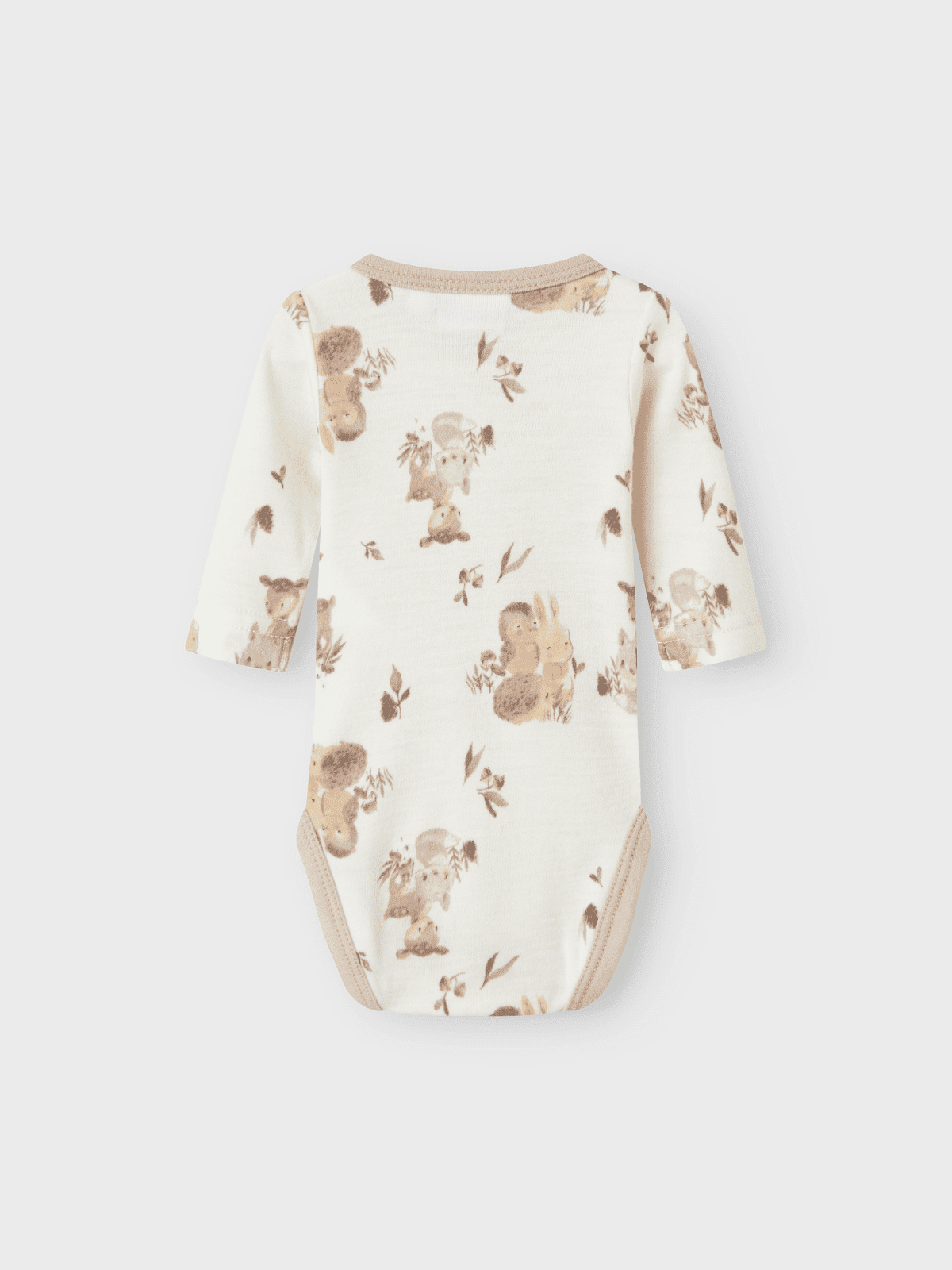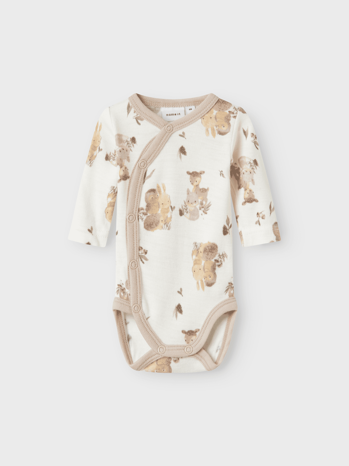 Tilfør nytt liv til barnets garderobe med tidløse og behagelige styles som passer til enhver anledning og årstid. Ull er et naturlig materiale som er kjent for sine termiske egenskaper, mykhet og lodne look. I kaldt vær holder ull på varmen, og på varme dager absorberer den svette, noe som gjør den til et godt valg uansett årstid. Ull lar huden puste og bevarer sin evne til å isolere når den er våt, og opprettholder alltid en stabil kroppstemperatur.. - Produkttype : Body - Hals : V-hals - Erme : Lange ermer - Lukking : Omslagslukking, Trykknapplukking - Mønster : Printet er gjentatt over hele overflaten av produktet Skall: 100 Ull - Merino - RWS