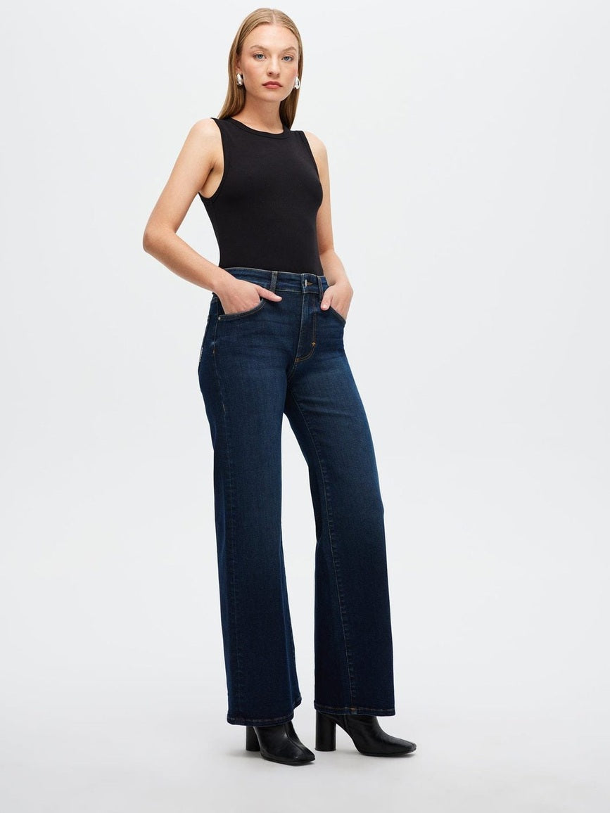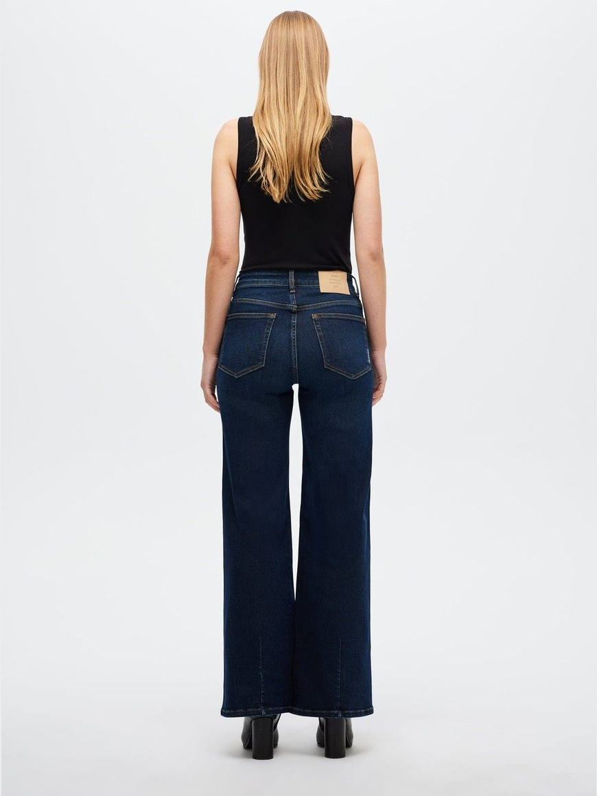 Eva Wide Dreamy Blues er et par tidløse jeans med en flatterende passform og et elegant, vidt snitt. Med en middels høy midje og lange, rette ben skapes en balansert silhuett som er både moderne og klassisk. Jeansen sitter tettsittende rundt midje, hofter og lår før den faller løst fra midt på låret, noe som gir en flatterende og behagelig passform.
