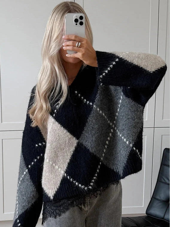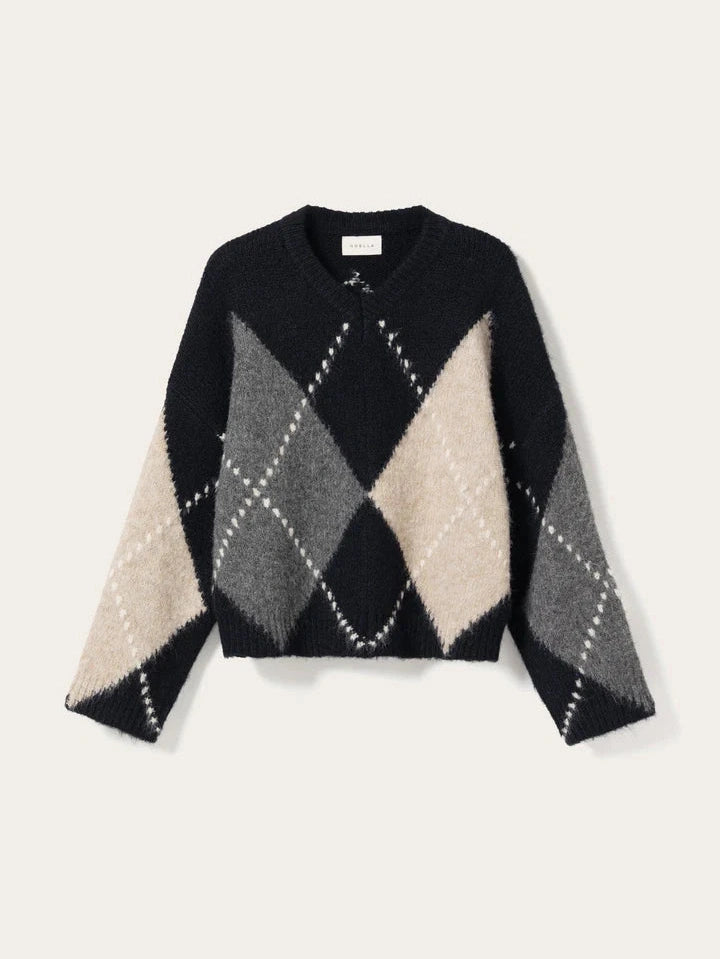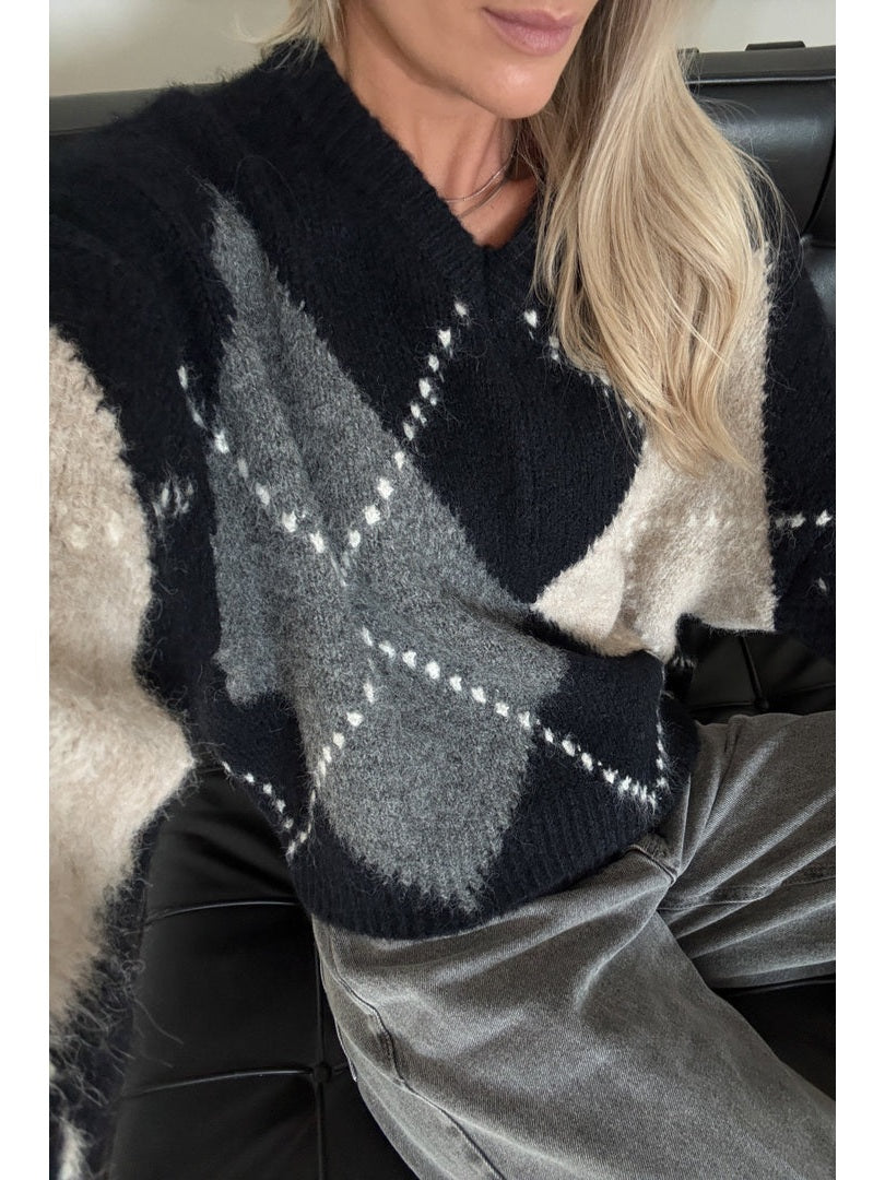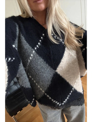 Denne myke strikkegenseren med rutemønster er et tidløst og allsidig plagg som passer perfekt i barnets garderobe eller voksenantrekk. Genseren har en liten V-hals som gir et elegant preg, samtidig som den er komfortabel og lett å ta på. Den avslappede passformen gjør den enkel å kombinere med både jeans, skjørt eller leggings, og gir en behagelig følelse gjennom hele dagen.