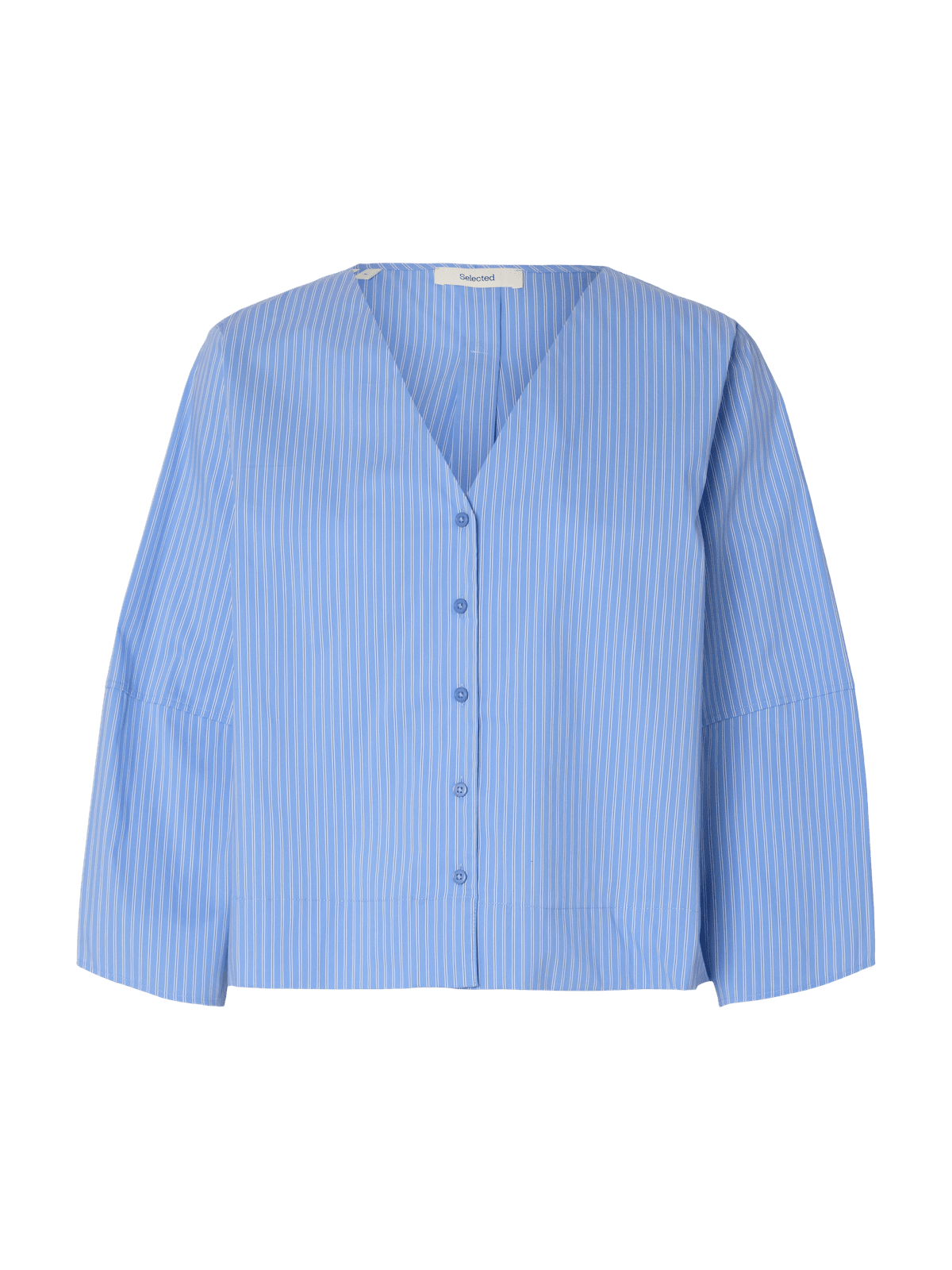 Bea skjorte i Dusty Blue fra Selected Femme er en lett og moderne skjorte som løfter garderoben din denne sesongen. Den myke blå tonen med delikate striper gir et friskt uttrykk, mens V hals, klassisk skjortekrage og 3/4 ermer skaper en feminin og avslappet silhuett. Med relaxed fit får du en komfortabel passform som faller fint og passer perfekt til både jobb og fritid.