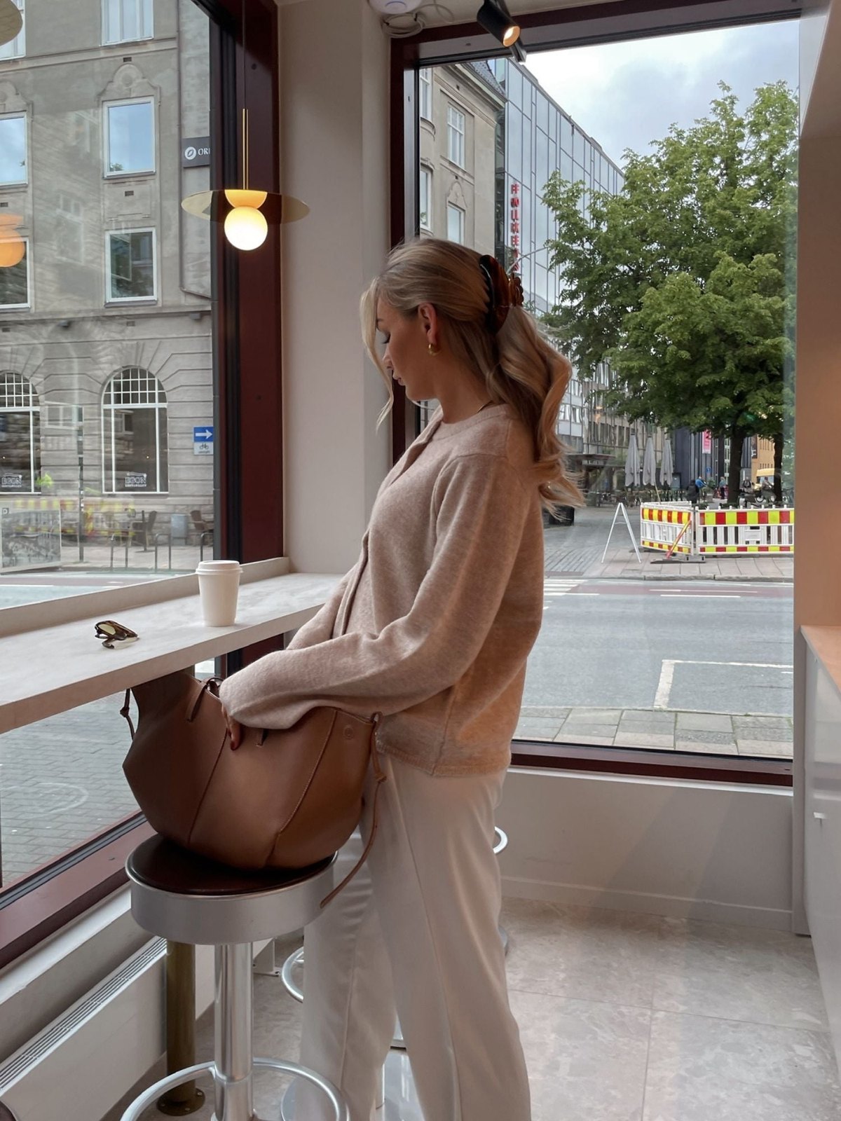 Cardiganen har et minimalistisk design med enkle knapper i front og et klassisk rund halsutsnitt. Ermene har en lett vid fasong som gir et avslappet og moderne uttrykk. Den litt løse passformen gjør den enkel å style både over en t-skjorte for hverdagsbruk eller en skjorte for en mer oppkledd look.