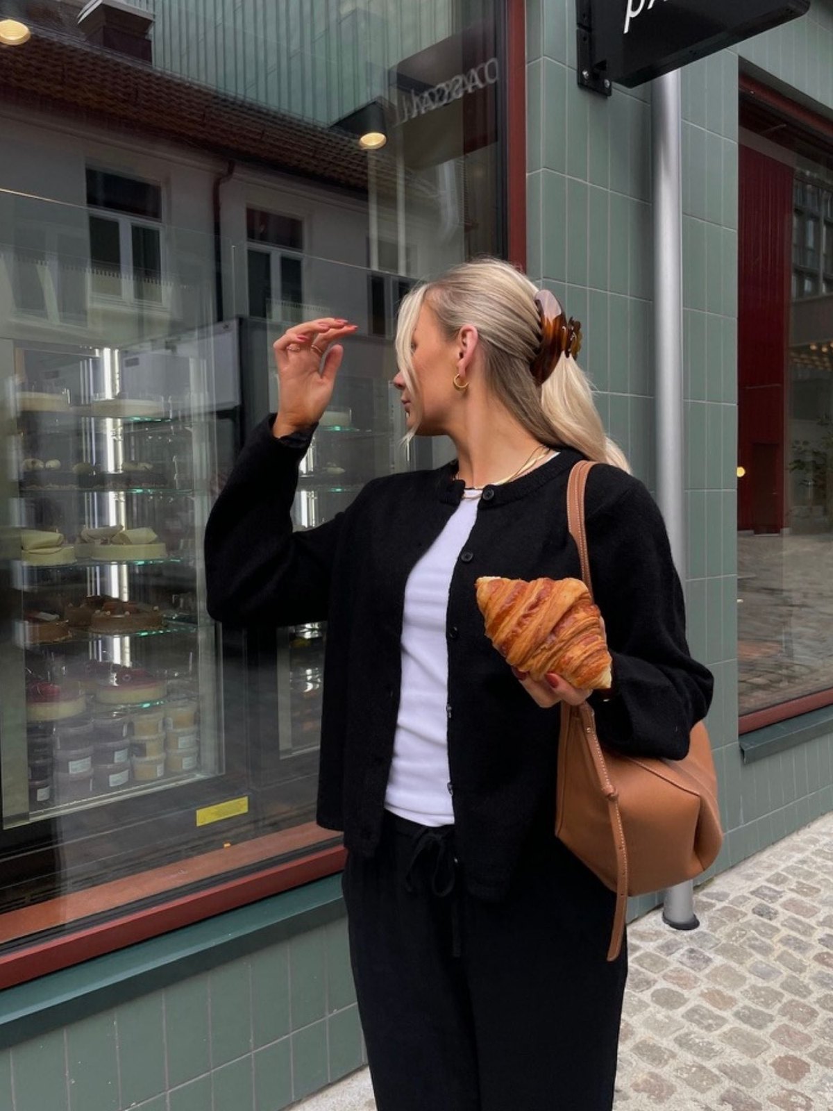 Cardiganen har et minimalistisk design med enkle knapper i front og et klassisk rund halsutsnitt. Ermene har en lett vid fasong som gir et avslappet og moderne uttrykk. Den litt løse passformen gjør den enkel å style både over en t-skjorte for hverdagsbruk eller en skjorte for en mer oppkledd look.