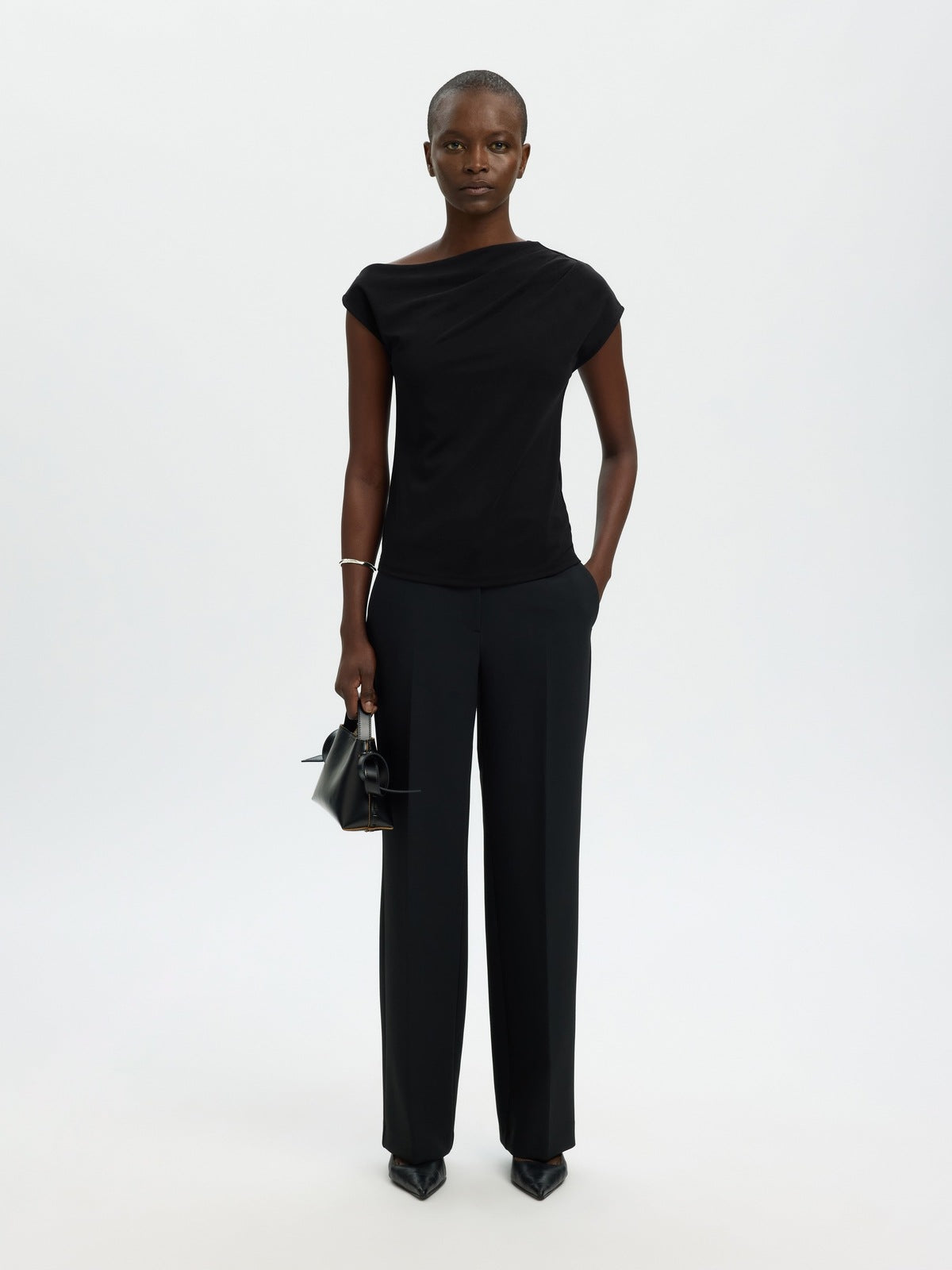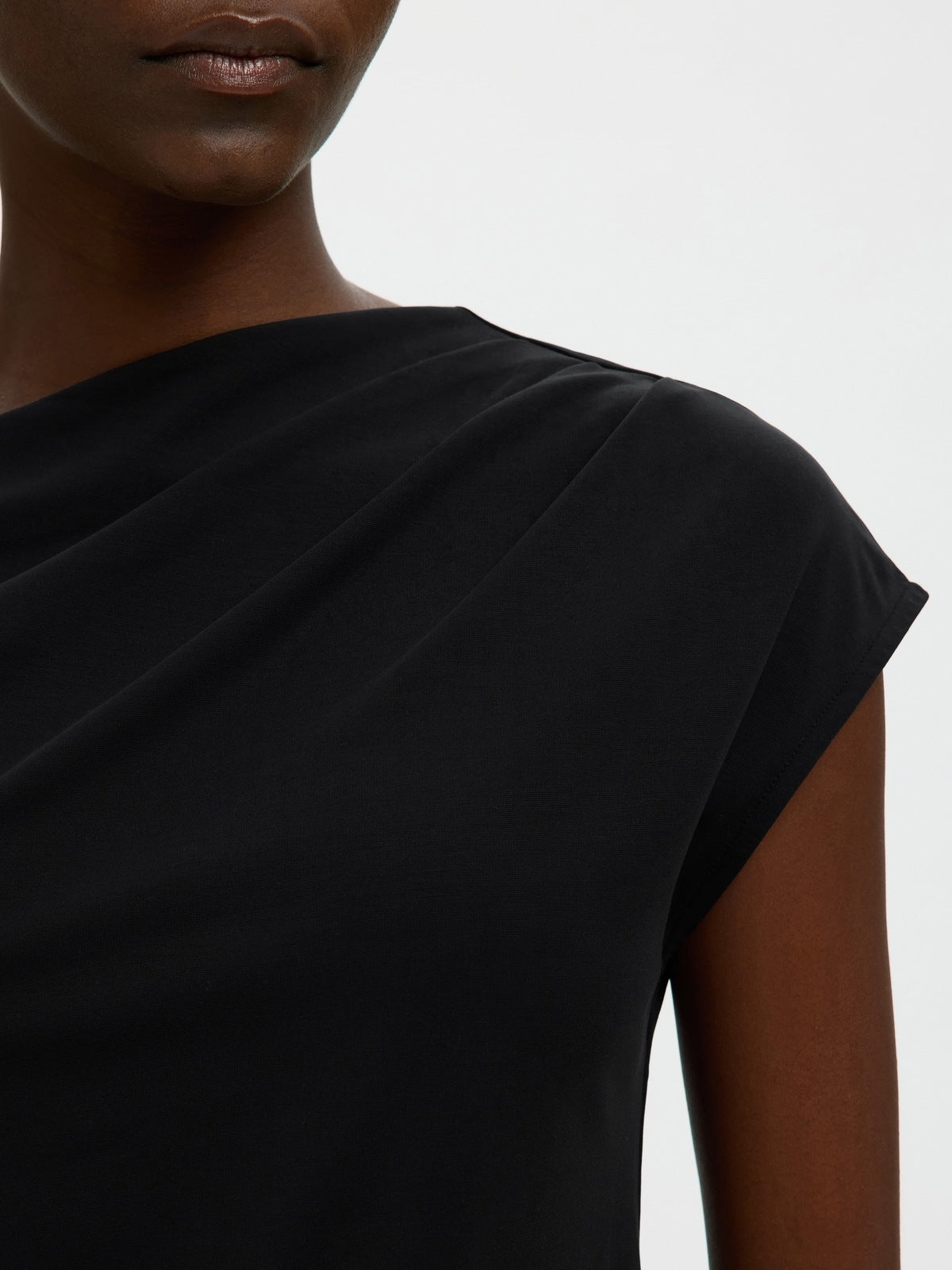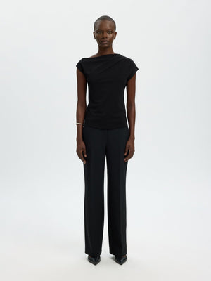 En stilren og moderne T-skjorte med asymmetrisk hals som gir et spennende og feminint uttrykk. Modellen har korte ermer og en samlet detalj som tilfører form og karakter. Regular fit sørger for en komfortabel passform som gjør den enkel å style til både hverdags og mer pyntede antrekk.