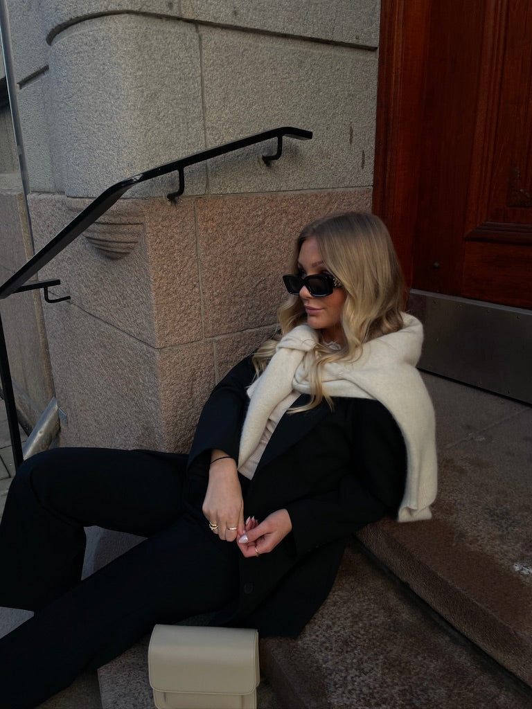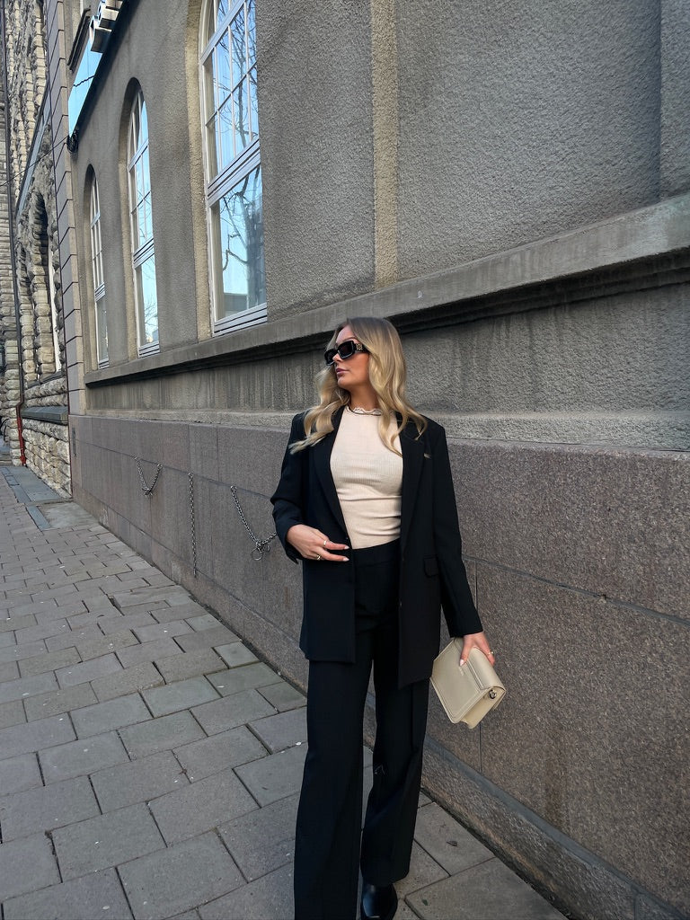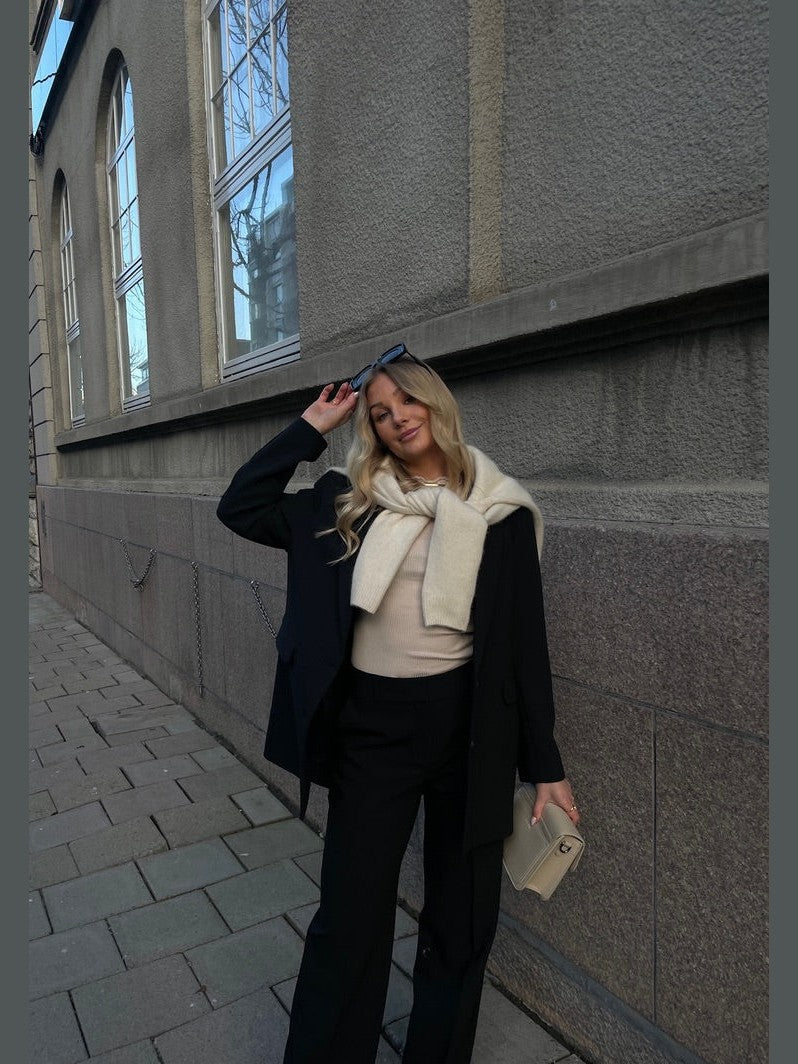 Laget i samme nydelige kvalitet som den tilhørende blazeren, gir den et gjennomført uttrykk når den styles som sett – men fungerer også like fint alene med en skjorte, strikkegenser eller en enkel t-skjorte. Den pressede fronten og den skreddersydde finishen gir buksen et rent og elegant fall.
