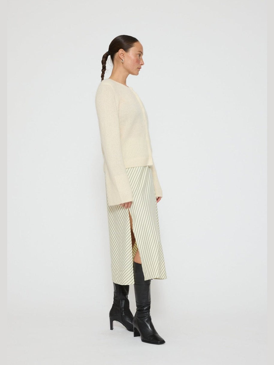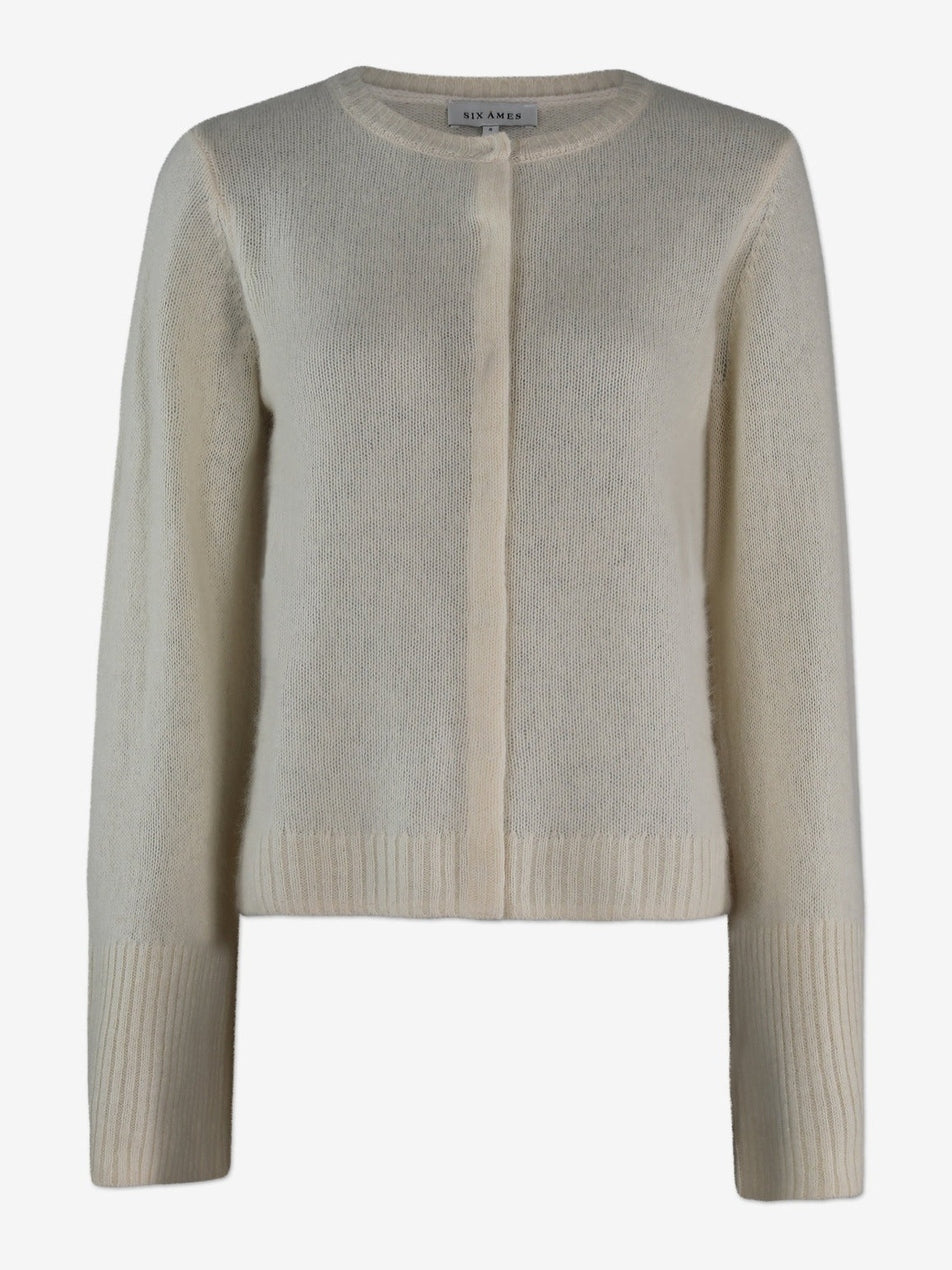 Duna er en cardigan laget av 100 % ultramykt vaskebjørn-ull, med en tettsittende silhuett og rund krage. Den har skjulte trykknapper som gir et rent og sømløst uttrykk. De vide ermene balanseres av brede kanter både ved ermene og nederst, noe som gir plagget en avslappet, men strukturert stil.