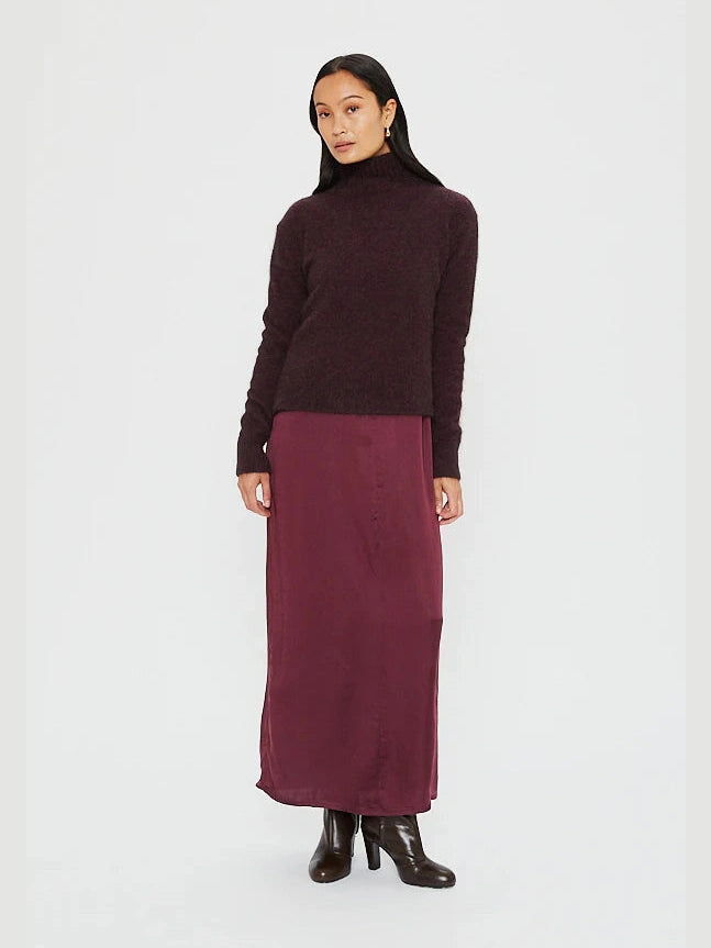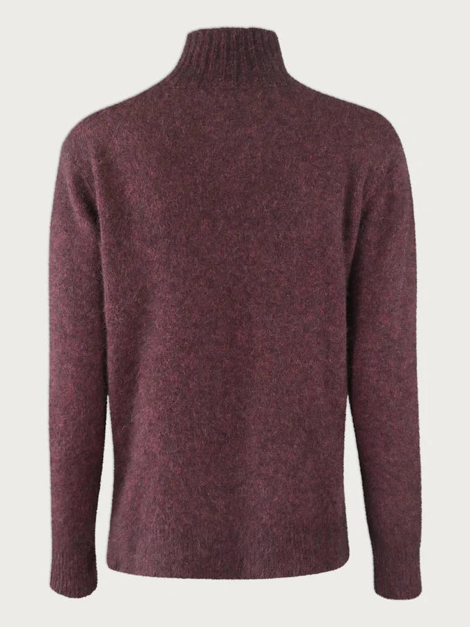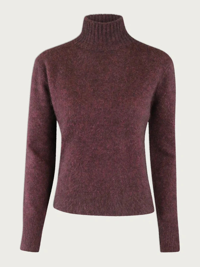 Jade er en genser med løs passform og tettere ermer, laget av 100 % ultramykt vaskebjørngarn, med høy rund hals og ribbekanter ved krage, mansjetter og nederkant. Et mykt og omsluttende plagg som gir både varme og komfort.